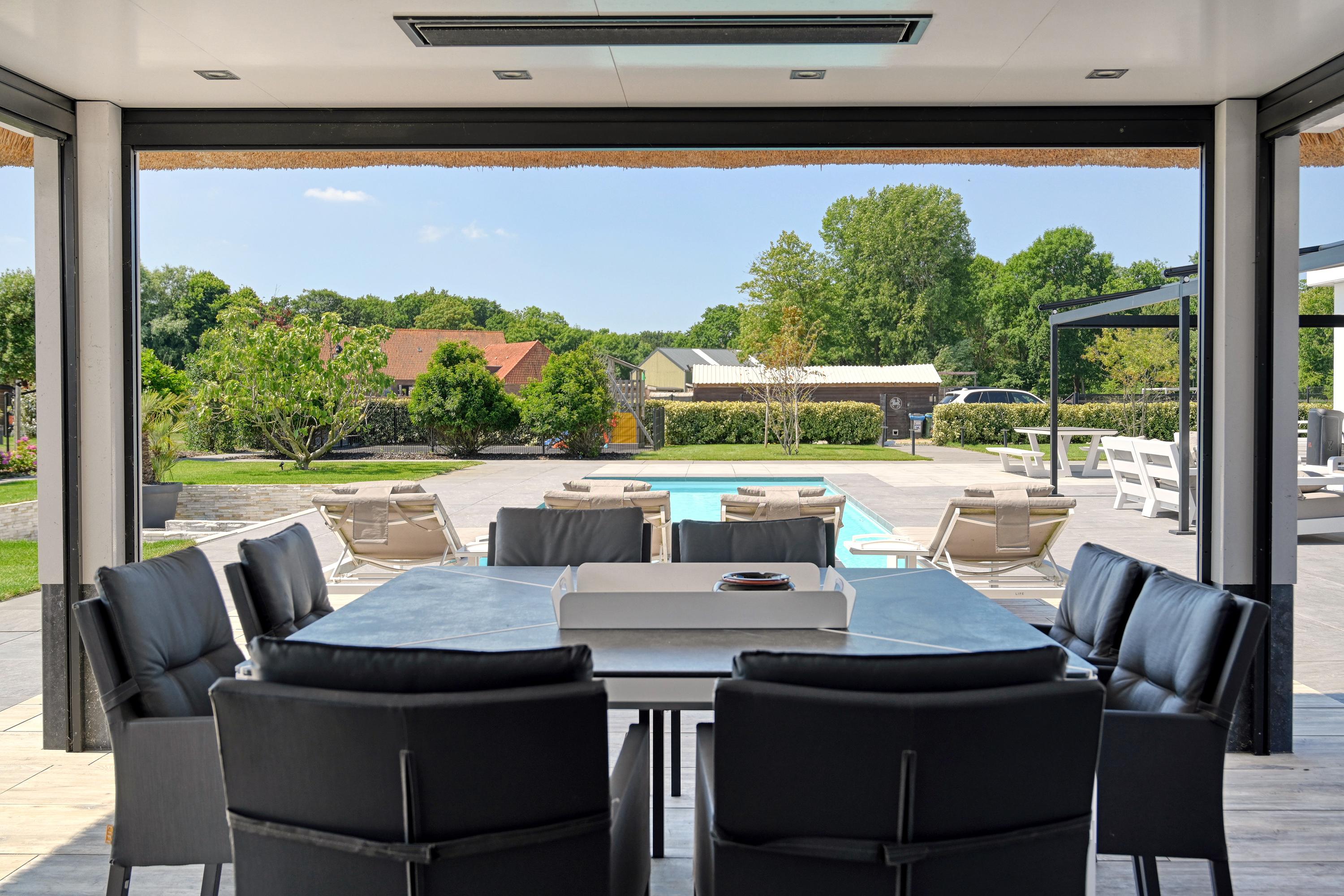 The pool house features a lovely veranda with heaters and screens. A storage attic spans the entire building and is accessible via a loft ladder.