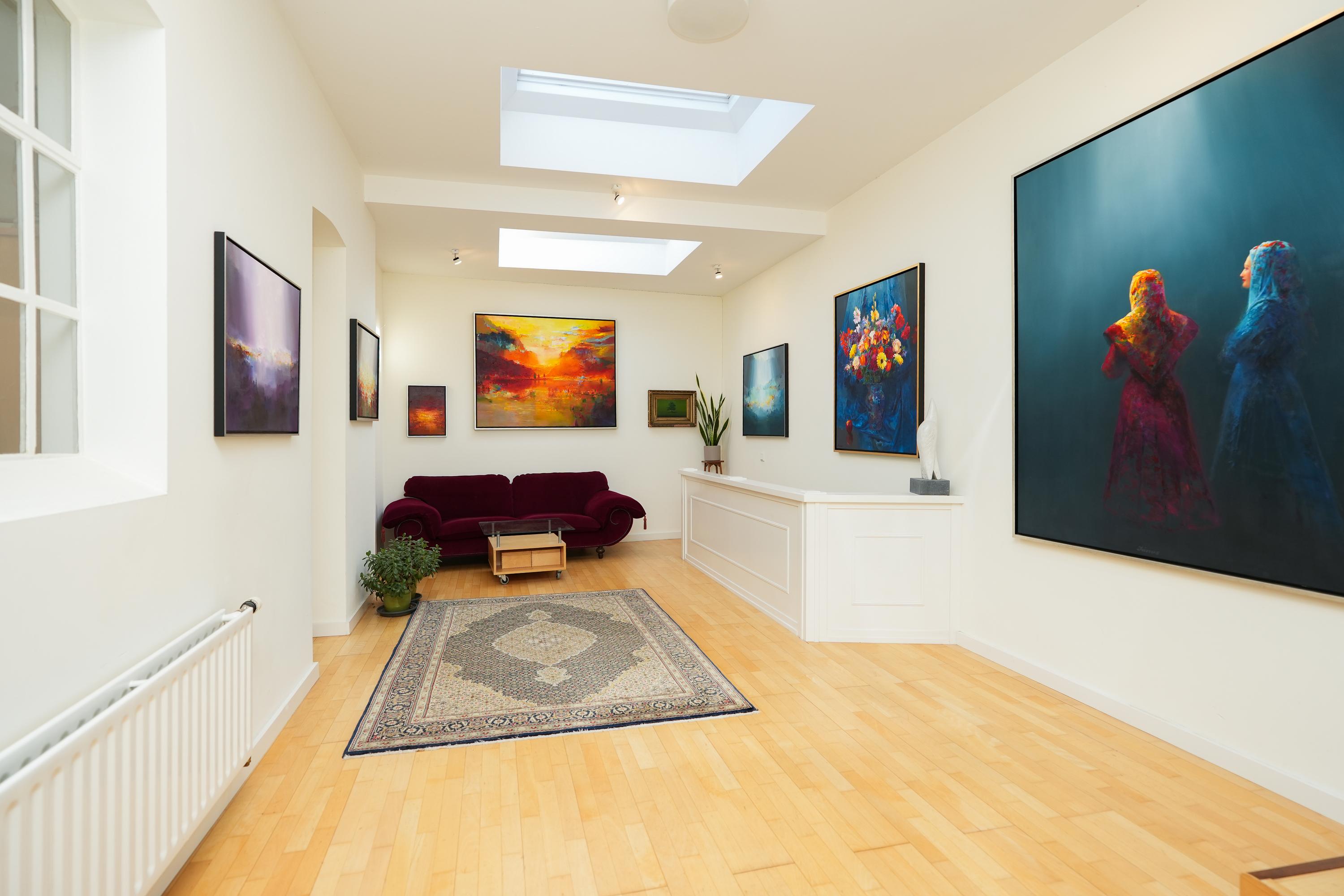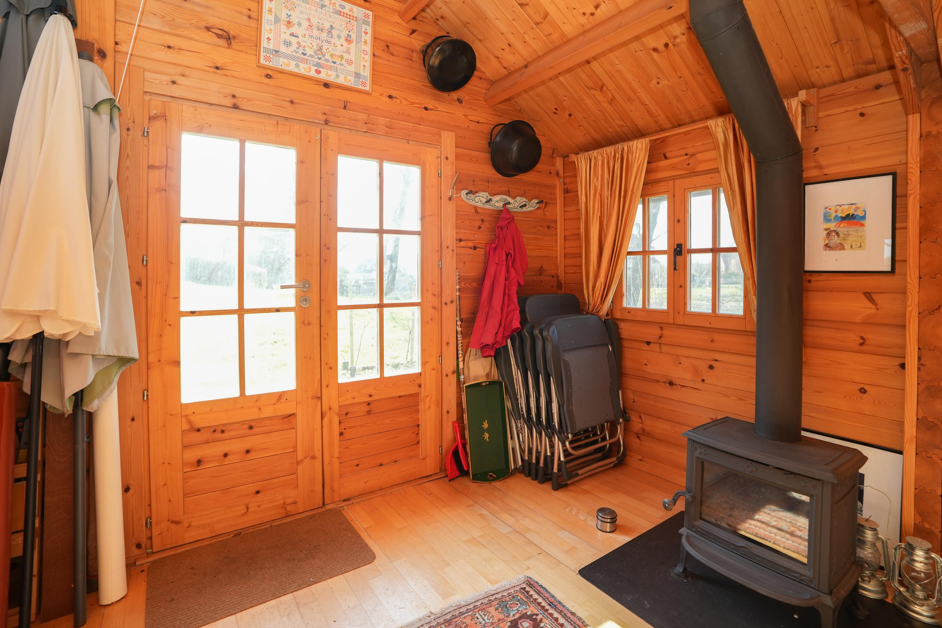 En entrant par le hall impressionnant, on découvre des connexions spatiales raffinées entre la cuisine avec coin repas, le salon et la bibliothèque privée. La galerie, accessible depuis la cuisine ou une entrée extérieure indépendante, conduit à l’atelier inondé de lumière, créant un espace de travail paisible avec vue panoramique sur la campagne. À l’étage, un large palier dessert la chambre principale, une salle de bain confortable, une chambre supplémentaire plus petite et un grenier aménagé en espace de rangement fonctionnel. Au total, la maison offre 287 m² de surface habitable sur un terrain de 2 445 m².