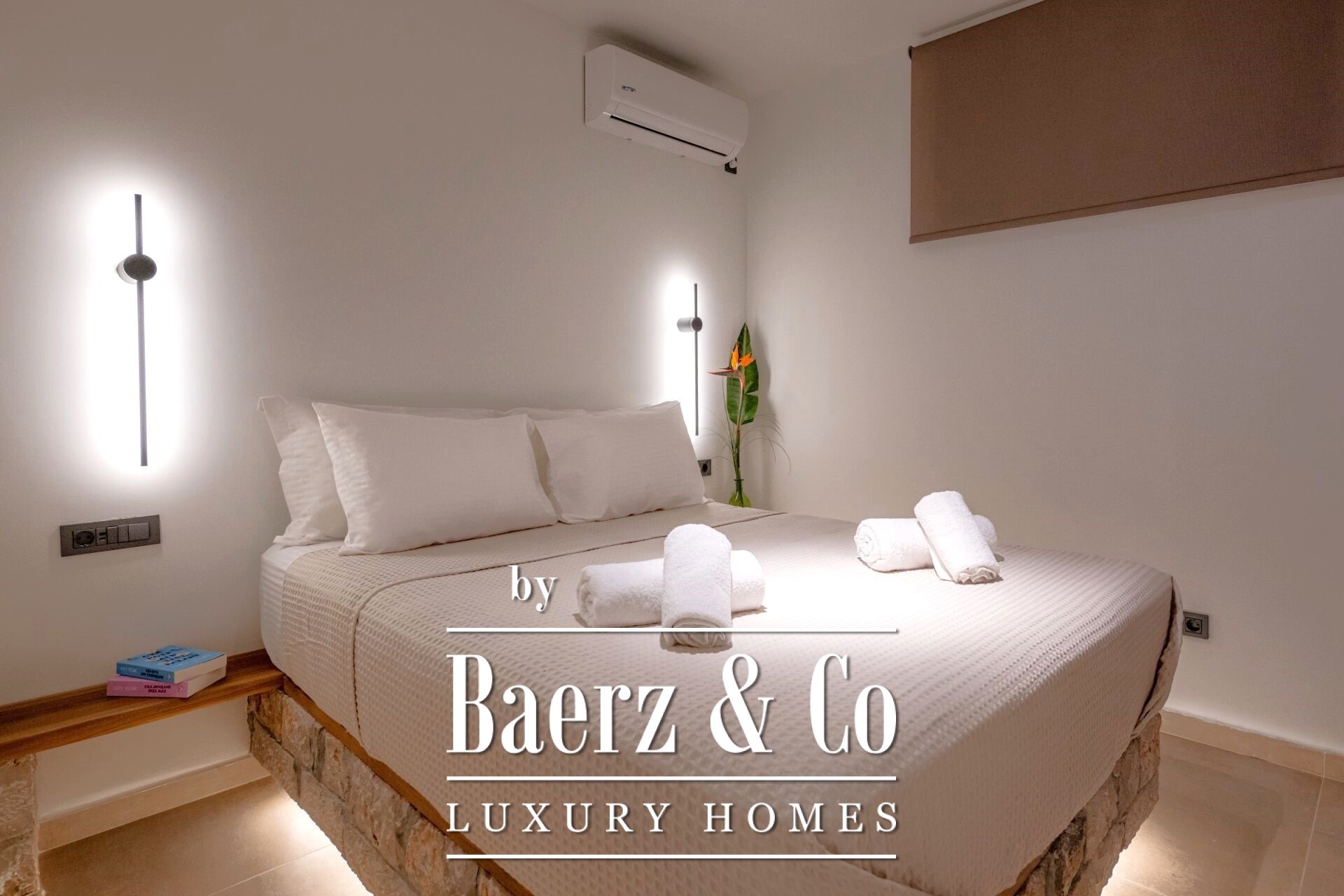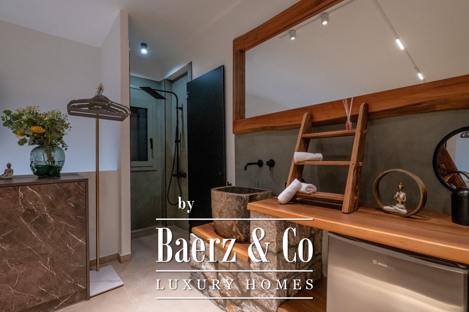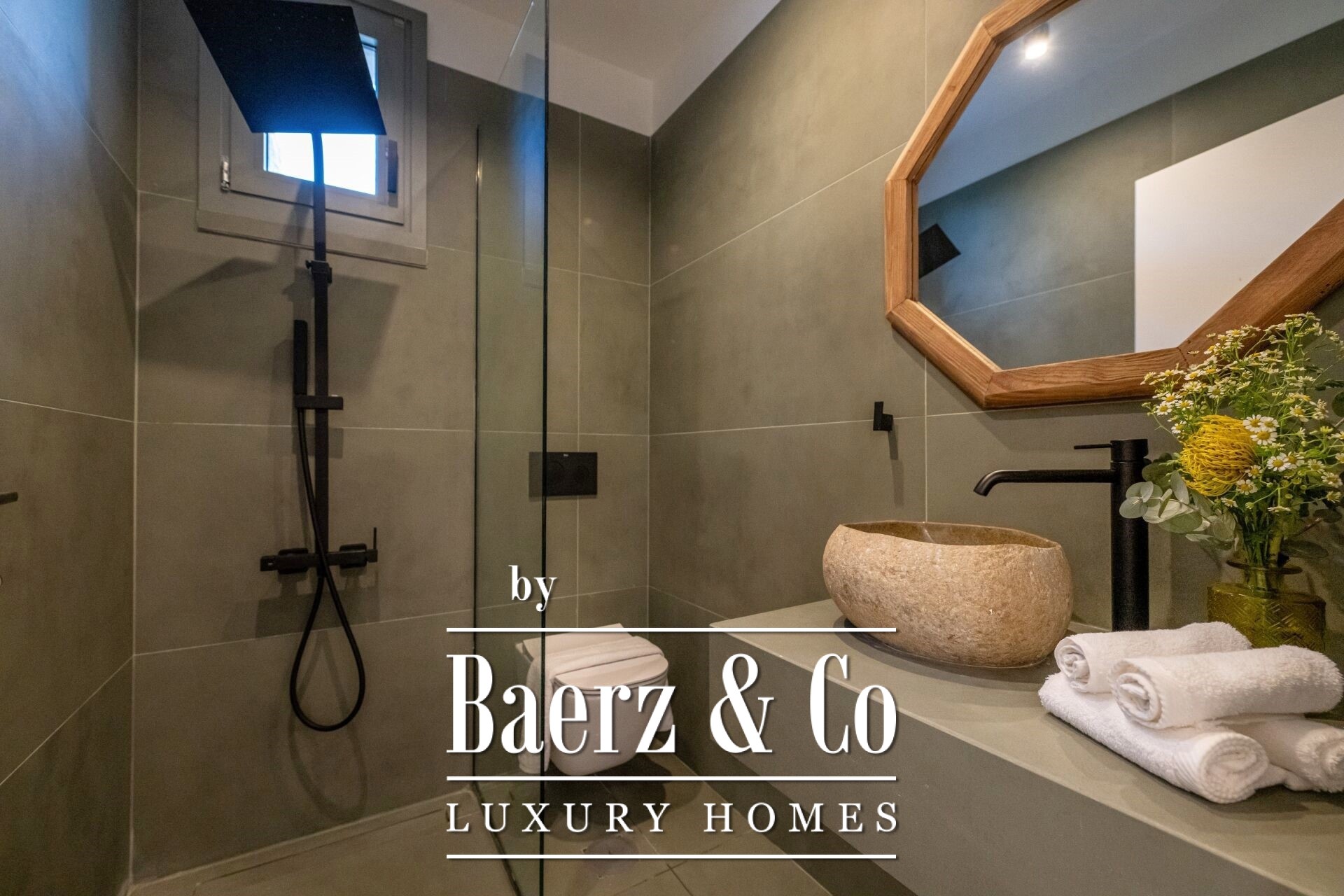 À l'extérieur, l’aménagement paysager évoque une atmosphère de resort. Une superbe piscine de 32 m² s'accompagne d’une vaste terrasse de 50 m² pour les repas en plein air. Des éléments tels qu’un muret en pierre, un jardin raffiné, une douche et un WC extérieurs, ainsi que deux places de stationnement privées derrière un portail électrique, créent un cadre sécurisé et serein. Les équipements modernes comprennent la climatisation, un chauffe-eau solaire, une classe énergétique A, des fenêtres à double vitrage et un système de sécurité complet avec alarme et caméras. La propriété est livrée entièrement meublée et équipée, apte à offrir un confort immédiat.