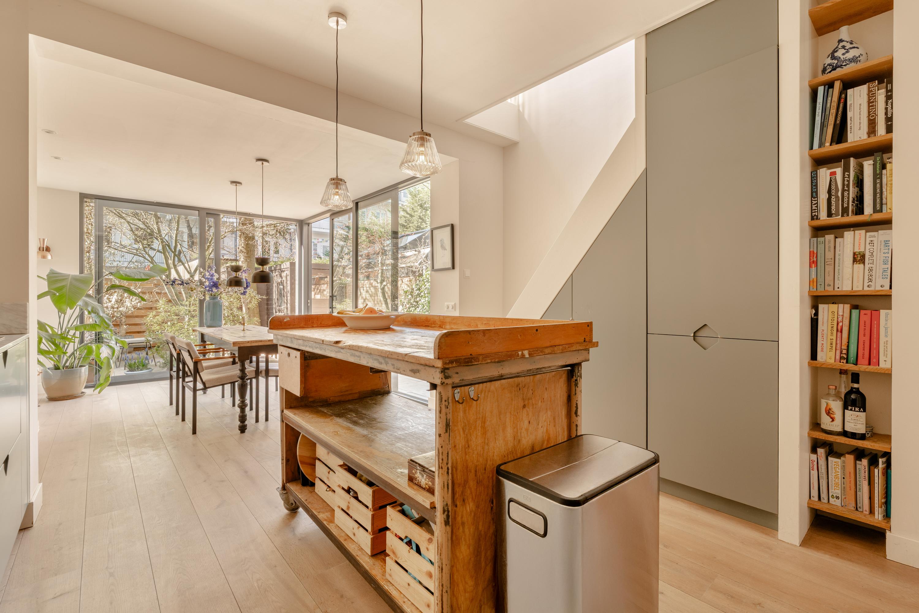 Aan de achterzijde bevindt zich een separate slaap-, werk- of studeerkamer met praktische inbouwkasten en openslaande deuren naar de tuin. Aansluitend treft u de fraaie uitbouw met een royale open keuken, voorzien van diverse inbouwapparatuur, waaronder een elektrische oven, inductiekookplaat met geïntegreerde afzuiging, koel-/vriescombinatie en een Quooker met kokend- en bruiswater.