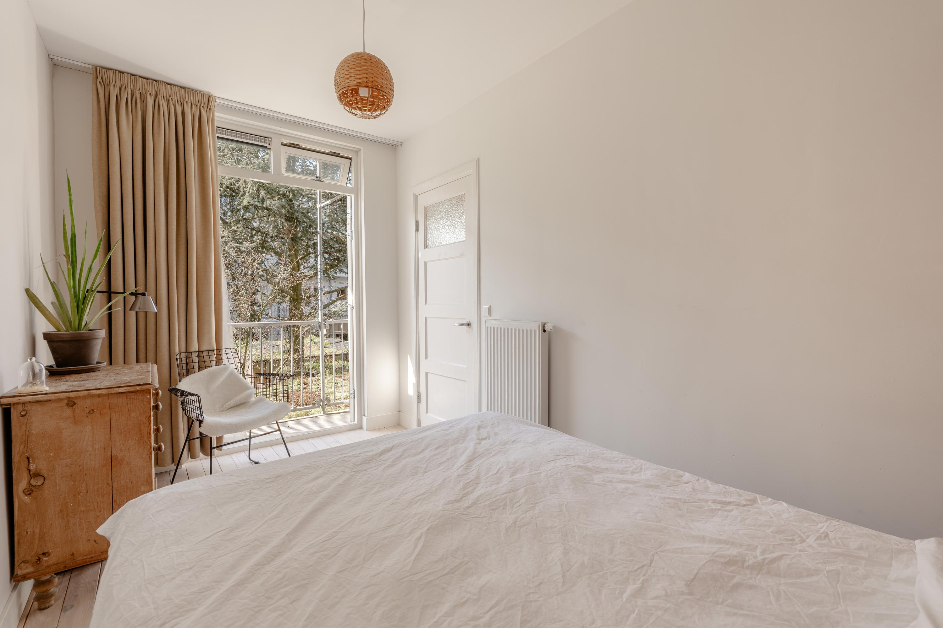 Aan de achterzijde van de woning bevinden zich twee goed bemeten slaapkamers, beide voorzien van openslaande deuren naar het balkon. Hierdoor ontstaat een fijne verbinding tussen binnen en buiten en genieten de kamers van veel licht en een groen uitzicht.