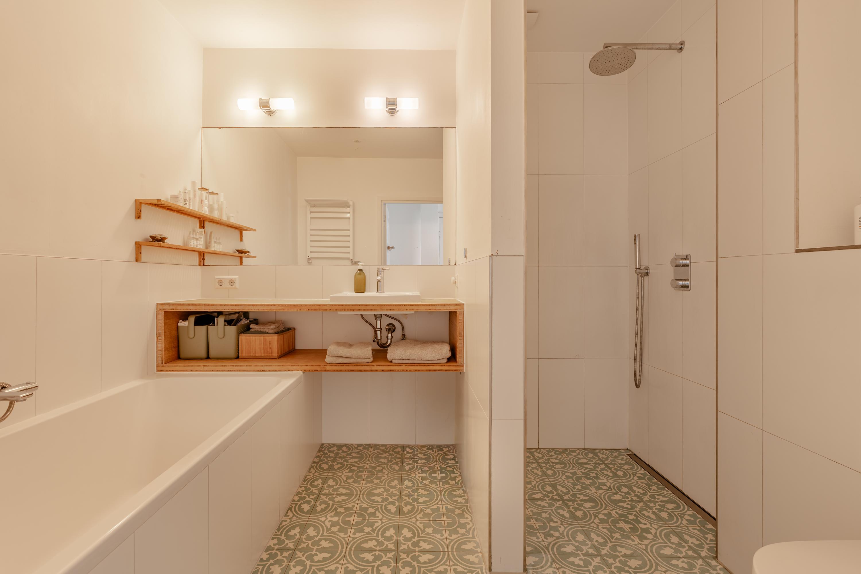Op de overloop bevindt zich de moderne badkamer, uitgevoerd in een rustige en verzorgde stijl en voorzien van een ligbad, inloopdouche, toilet en een fraaie wastafel met meubel.