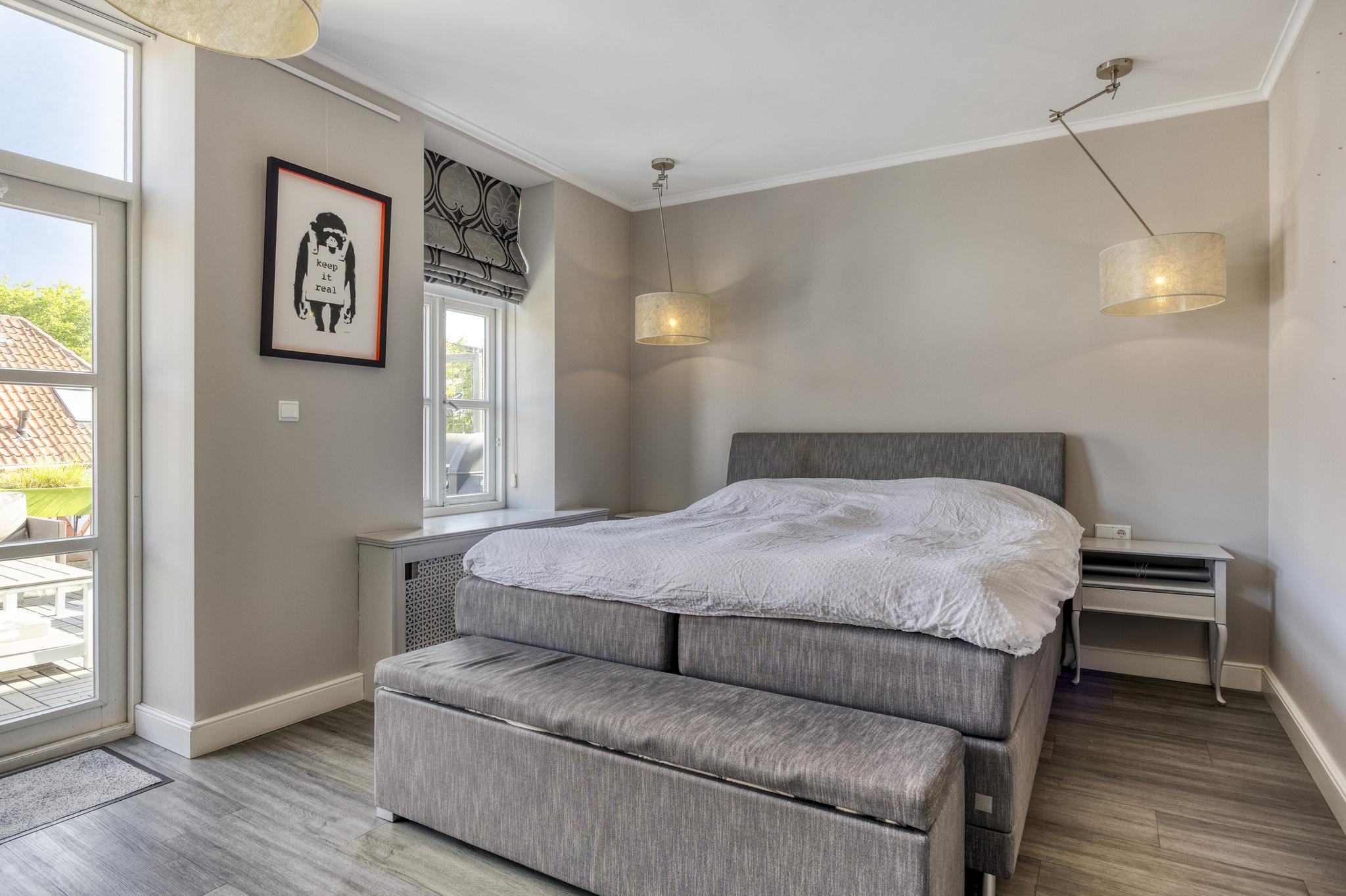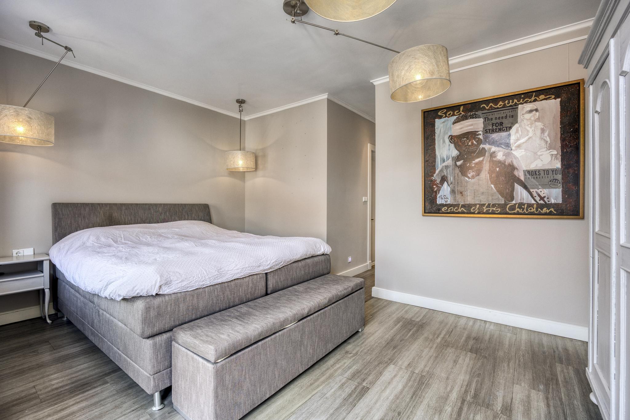 royale slaapkamer voor met een inbouwkastenwand, wandafwerking stucwerk, houten vloer, plafond afgewerkt met stucwerk;