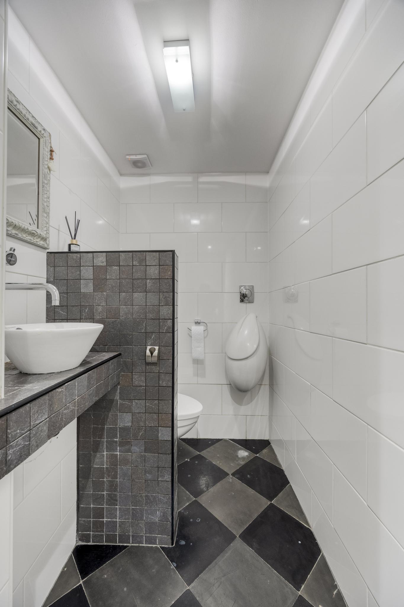 luxe en royaal betegeld toilet met een wandcloset, urinoir en een fonteintje;