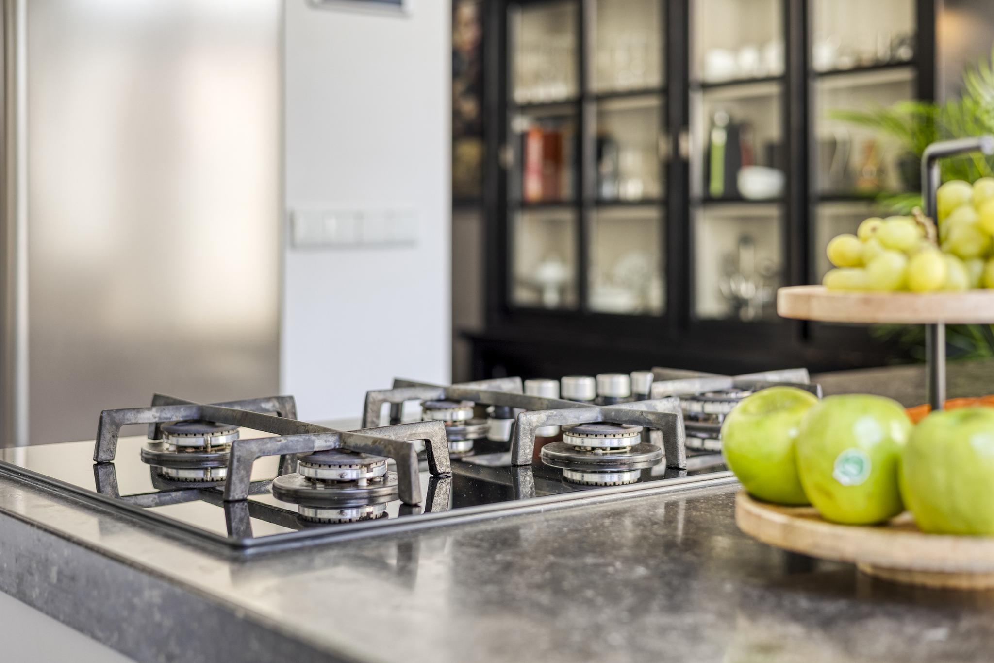 open woonkeuken, waarin geplaatst een in de lengte opgestelde inbouwkeuken met kookeiland, voorzien van een granieten aanrechtblad met een spoelbak, inbouw 5-pits gaskookplaat, -opstelplaats Amerikaanse koel/vriescombinatie, -stoomoven, - 2-tal warmhoudlades, -vaatwasser en een afzuigkap, wandafwerking stucwerk, tegelvloer, plafond afgewerkt met spuitwerk vv. inbouwspots, tuindeuren naar tuin/terras;