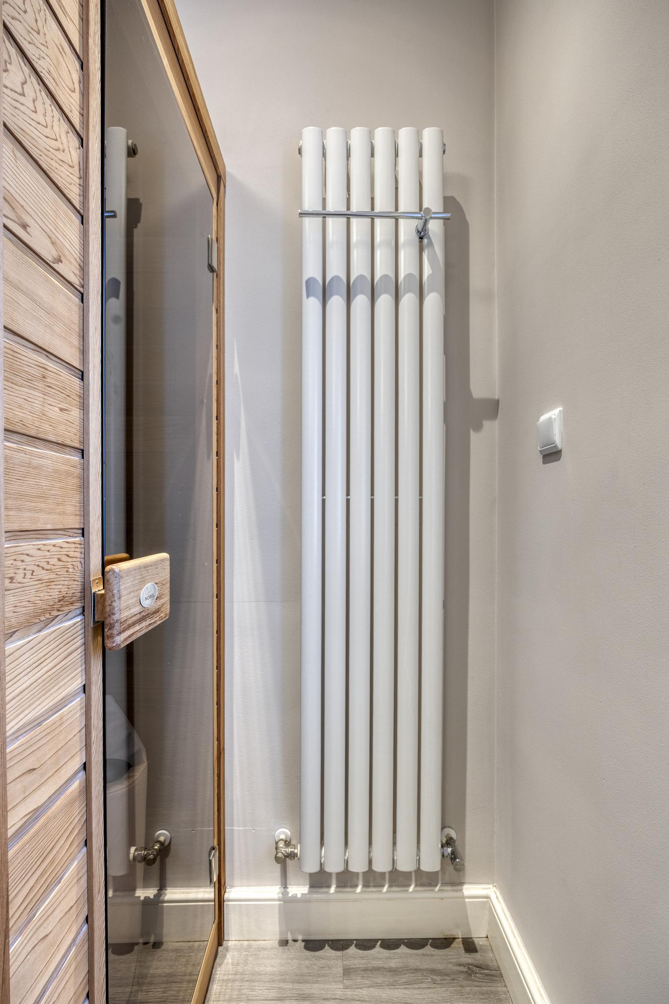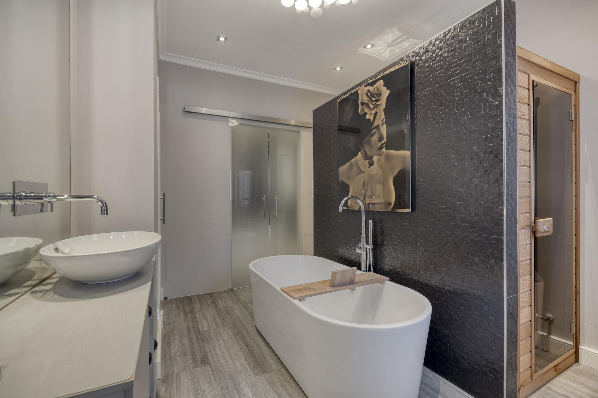 betegelde badkamer en-suite, voorzien van een vrijstaand ligbad, inloopdouche, infrarood sauna, badkamermeubel met een wastafel en een deur naar separaat toilet en inloopkast;
