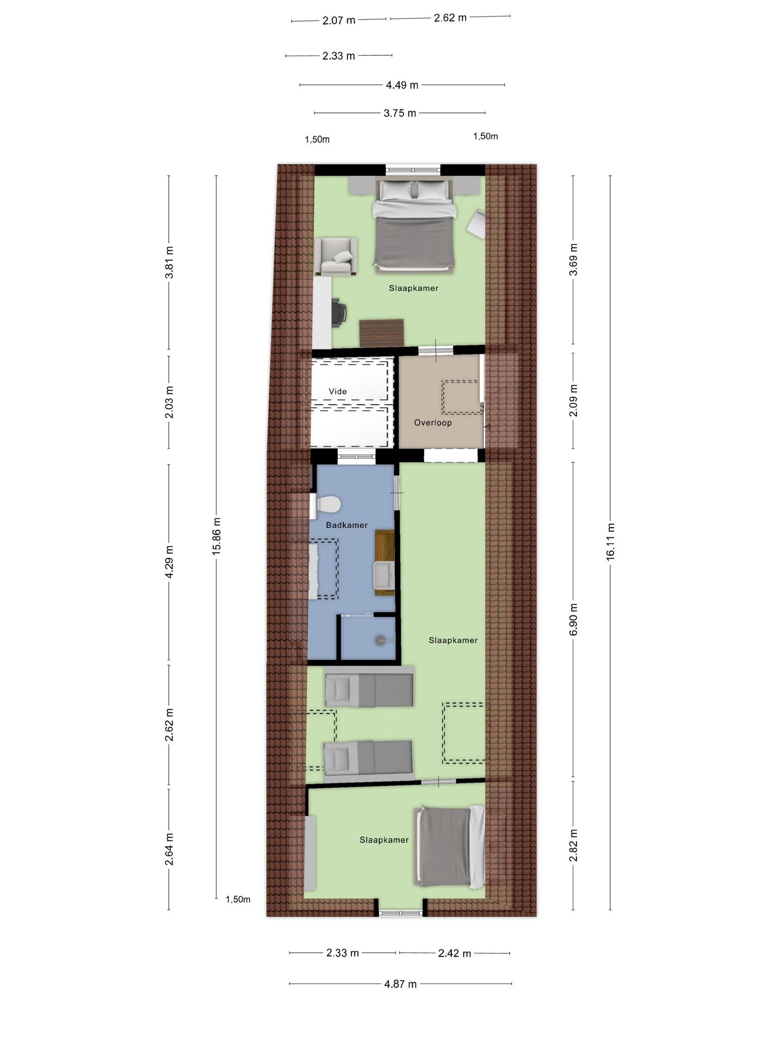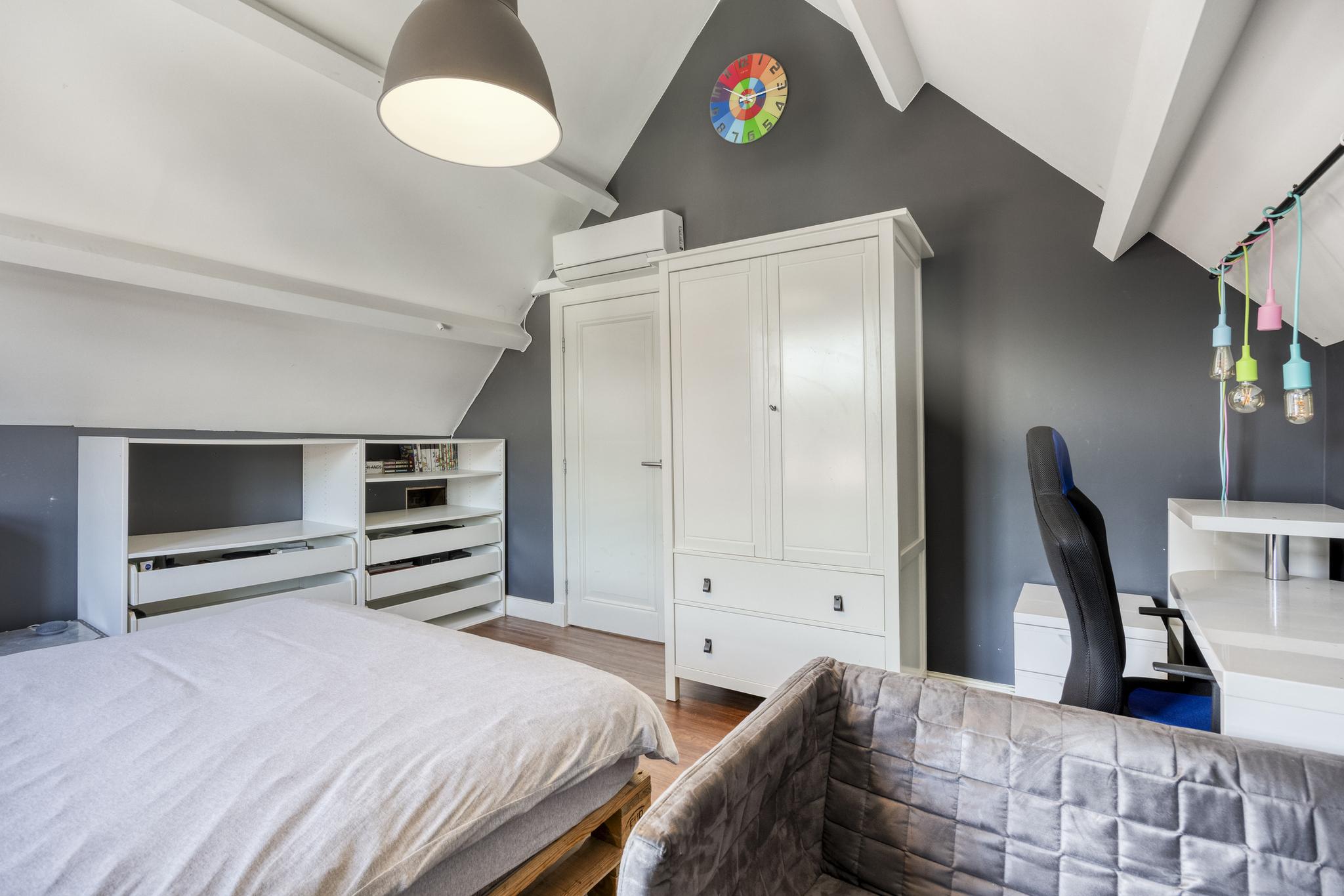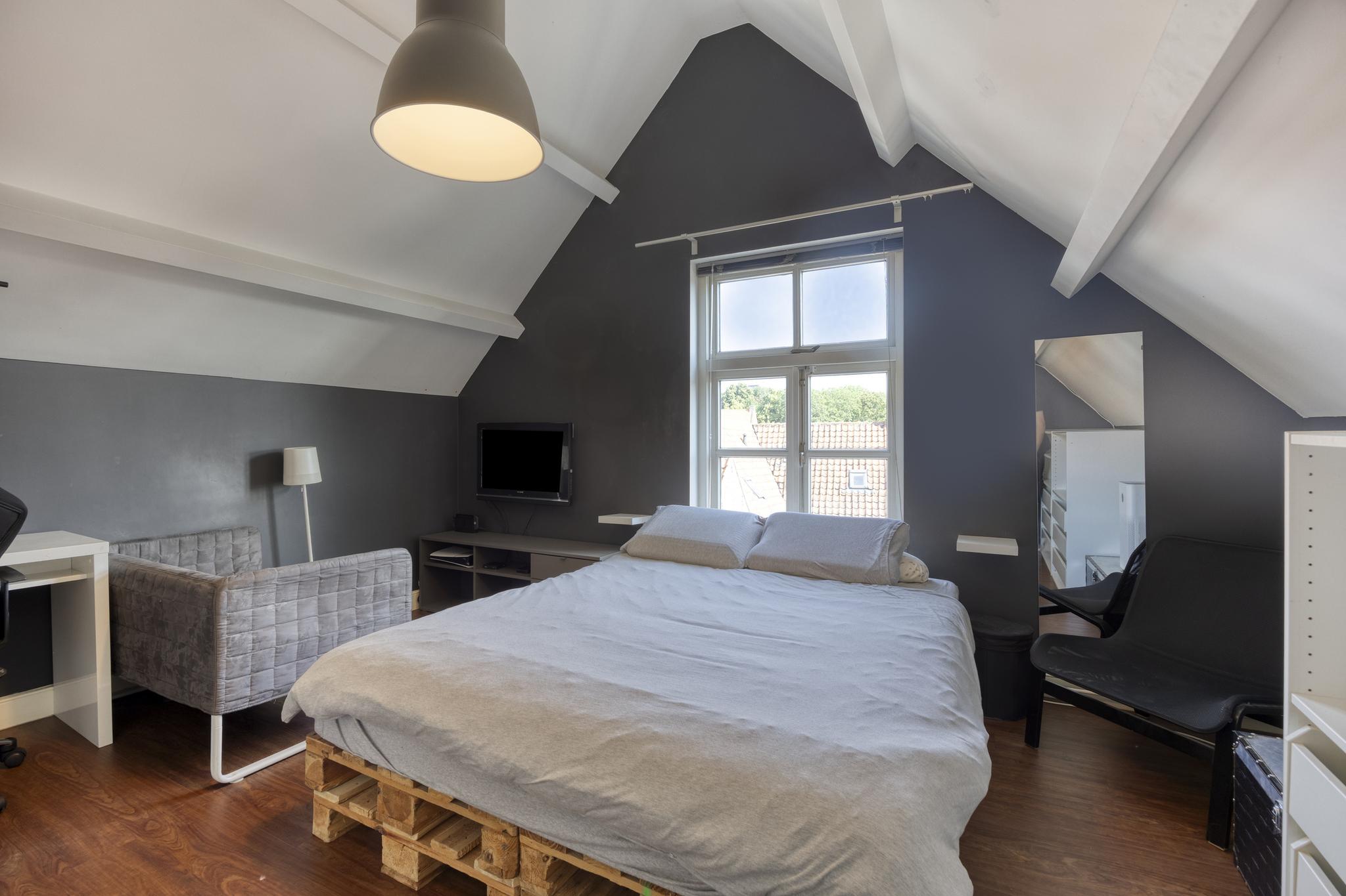 slaapkamer voorzijde met een dakkapel en een airco-installatie, wandafwerking stucwerk PVC-vloer, schuine dakvlakken afgewerkt met stucwerk;