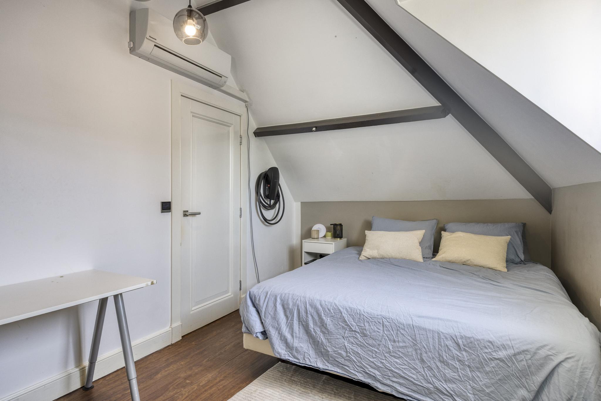 slaapkamer achterzijde met een airco-installatie, wandafwerking stucwerk PVC-vloer, schuine dakvlakken afgewerkt met stucwerk;