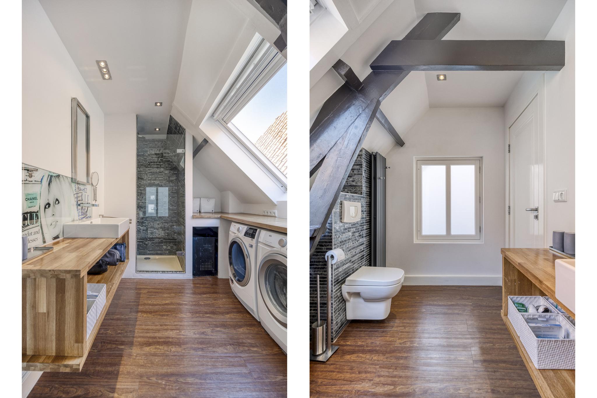 betegelde badkamer, voorzien van een inloopdouche, badkamermeubel met een wastafel, wandcloset, wasmachine-/drogeraansluiting en een dakraam.