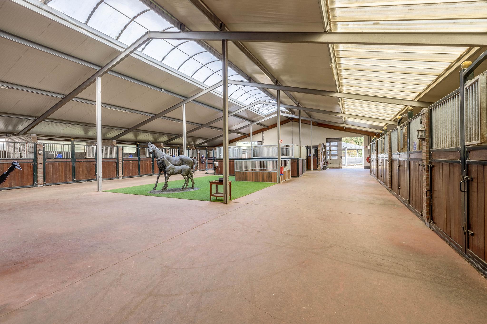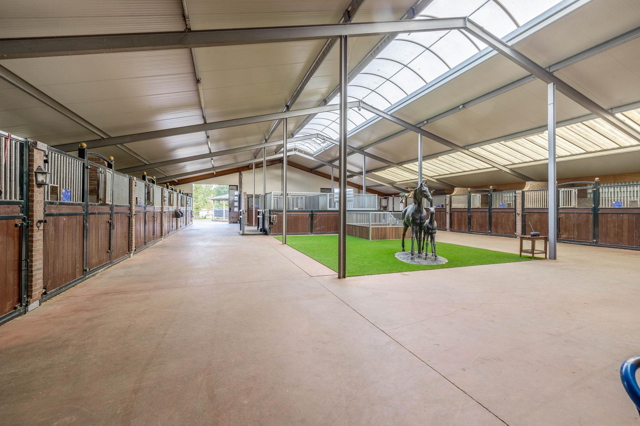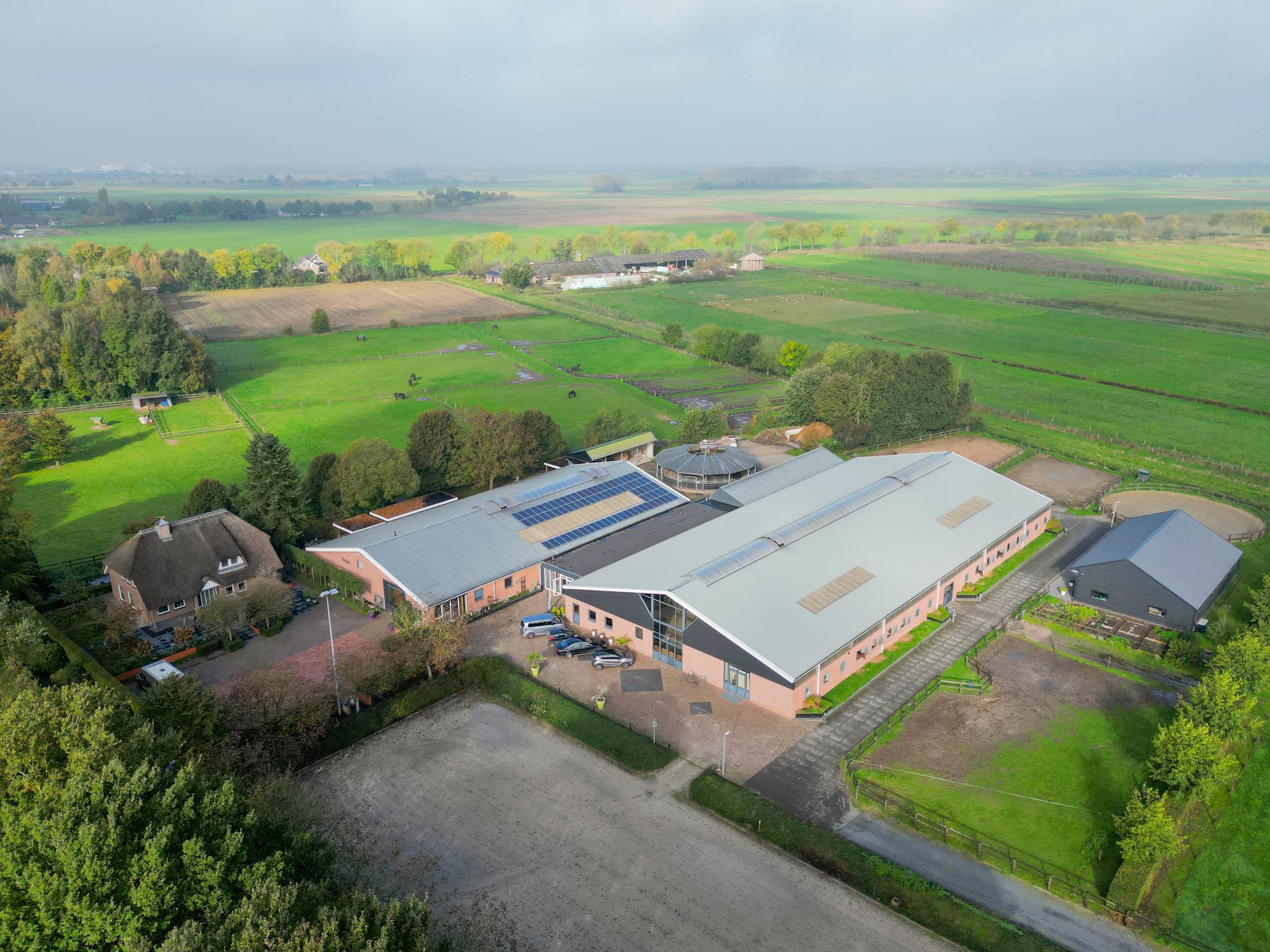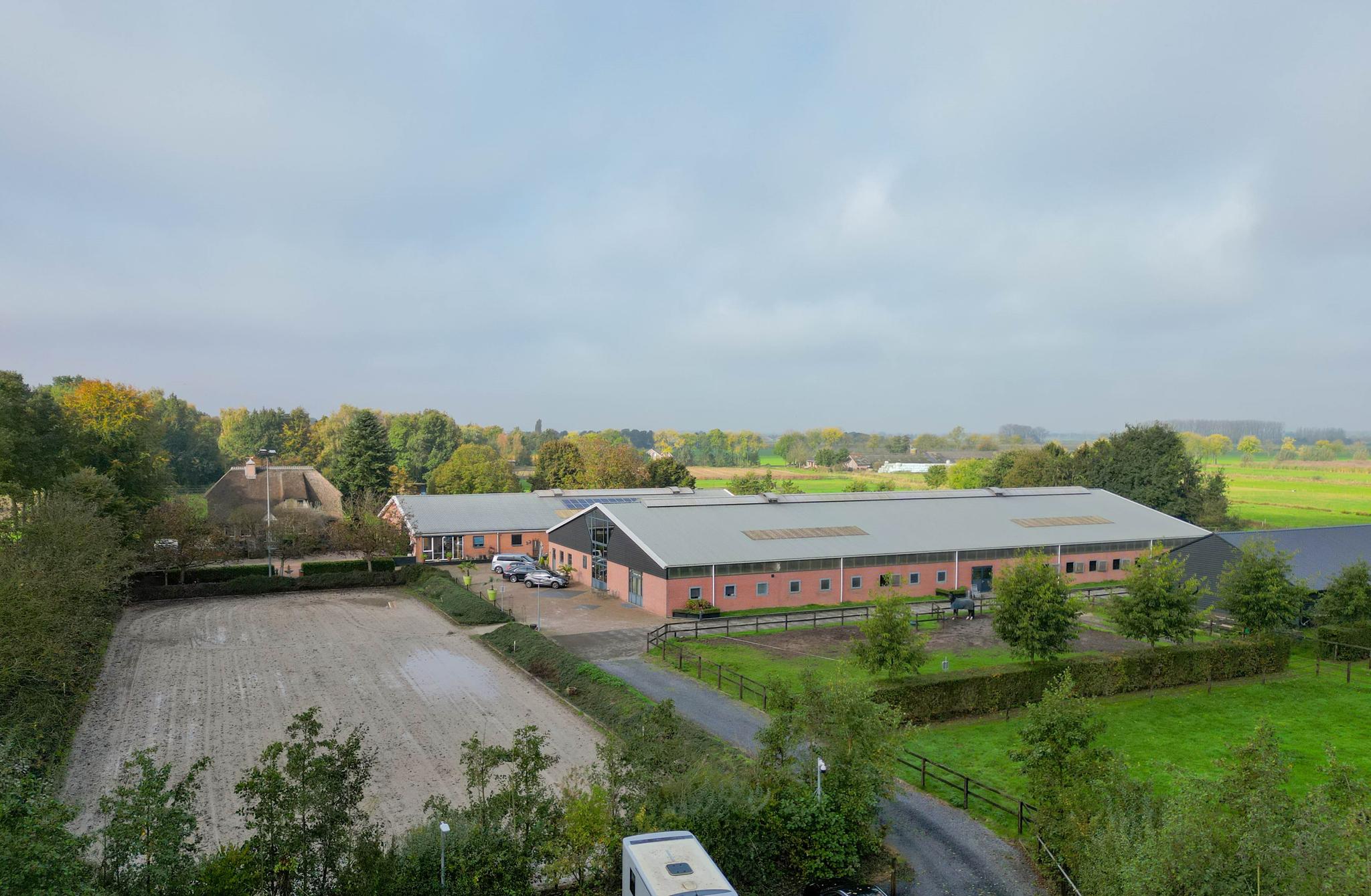 Complete hippische accommodatie o.a. uitgerust met een vrijstaand woonhuis, appartement, kantoorgedeelte, een rijhal met binnenpiste en in totaal 31 paardenboxen, een buitenpiste, overdekte stapmolen, longeercirkel, diverse paddocks, weiland, een opslag/veldschuur en een vrijstaande loods.