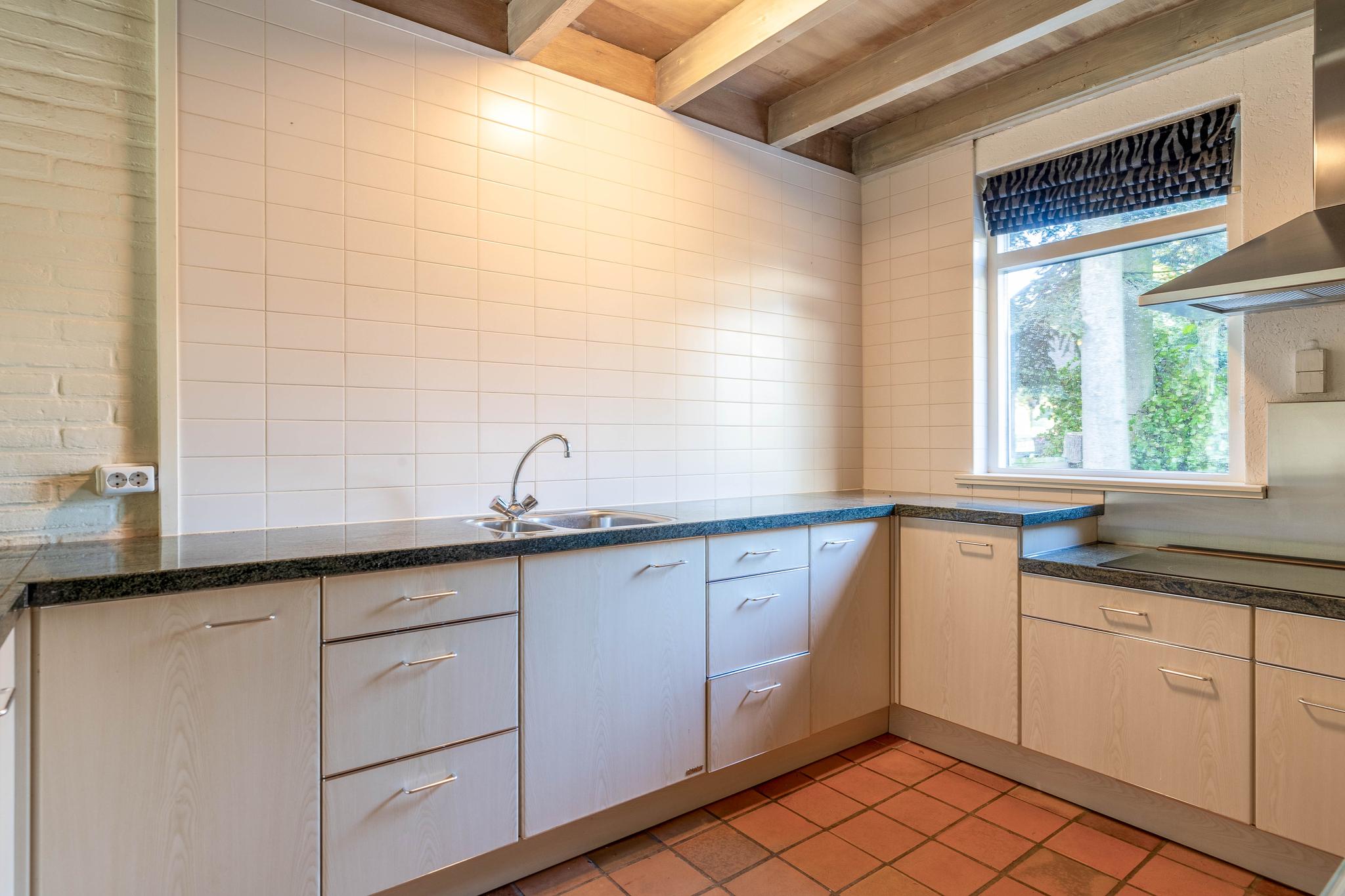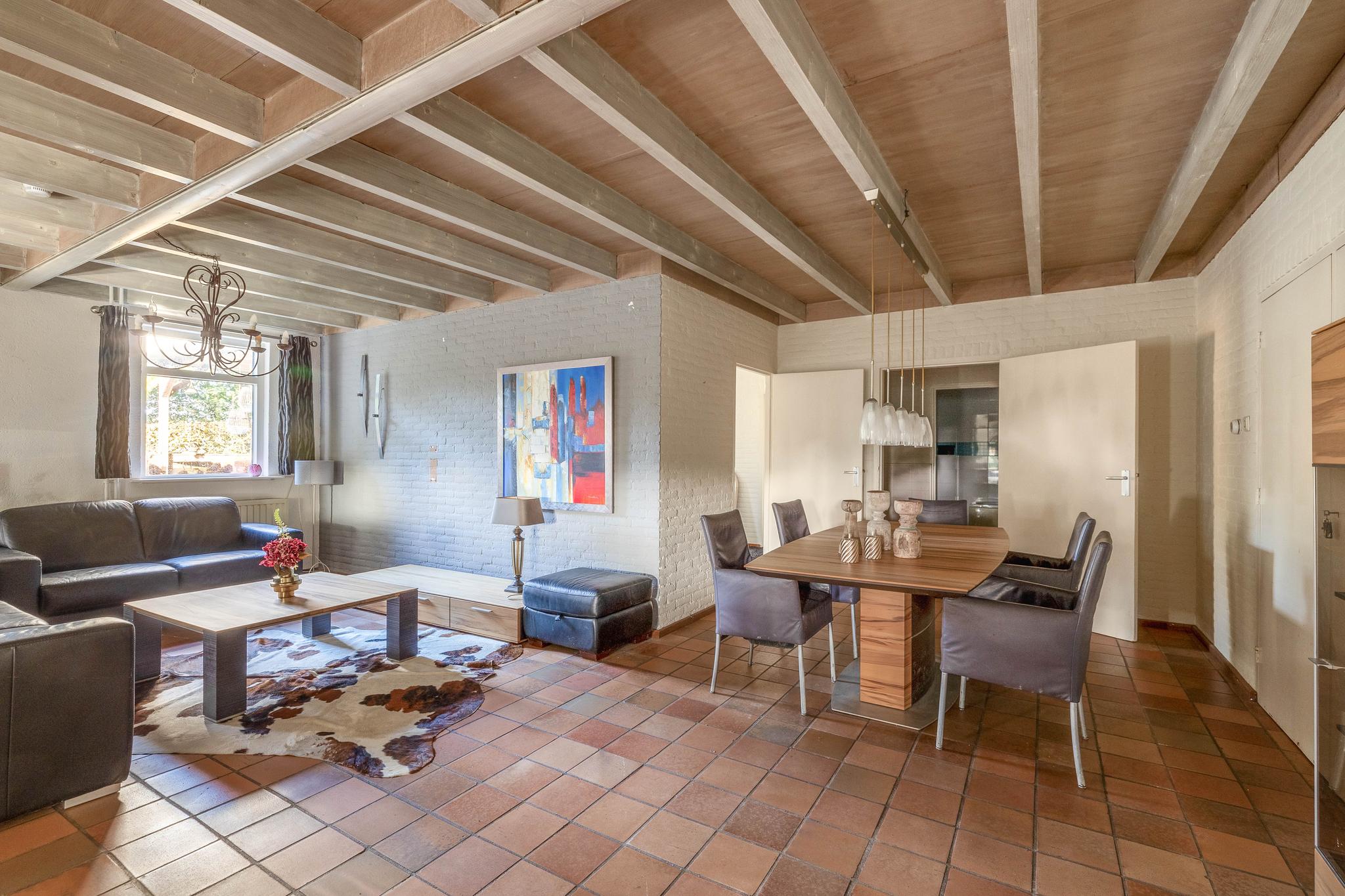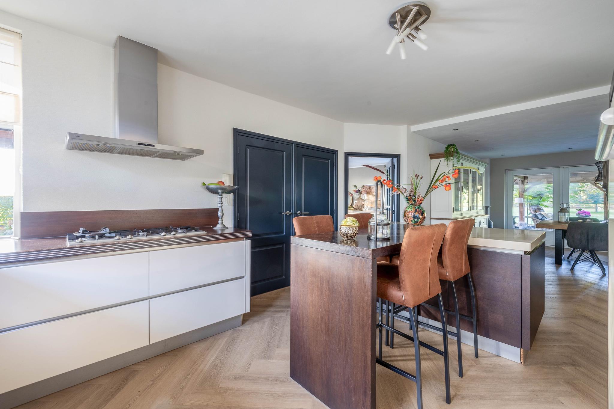 De hal biedt toegang tot de woonkamer, meterkast en middels een vaste trap is er toegang tot de 1e verdieping. De hal is voorzien van een PVC-vloer in visgraatmotief, deels metselwerk/ deels stucwerk wanden en een stucwerk plafond. De hal biedt toegang tot de woonkamer, meterkast en middels een vaste trap is er toegang tot de 1e verdieping. De royale leefkeuken is eveneens voorzien van dezelfde PVC-vloer in visgraatmotief. De wanden en het plafond zijn voorzien van stucwerk. De keukeninrichting is in een U-opstelling met een bergeiland. De keuken is verder uitgerust met een vaatwasser, combimagnetron, spoelbak, 5-pits gaskookplaat en een koelkast. Vanuit de keuken is er toegang tot de kelder. De kelder is geheel betegeld en uitgerust met een koekoek en een raam. Er zijn vaste schappen en een houten trap aanwezig. Een luik biedt toegang naar de ruimte onder de woning. De praktische bijkeuken is deels betegeld en de vloer is bedekt met een tegelvloer welke is voorzien van vloerverwarming. Praktische schuifkasten zorgen voor opbergruimte. Hier zijn de opstelling voor de CV-combiketel, de unit voor de vloerverwarming en de aansluitingen voor de wasapparatuur gesitueerd. Vanuit de bijkeuken is er toegang tot de toiletruimte en het erf. De toiletruimte is geheel betegeld en verder voorzien van een fonteintje en een zwevend toilet.