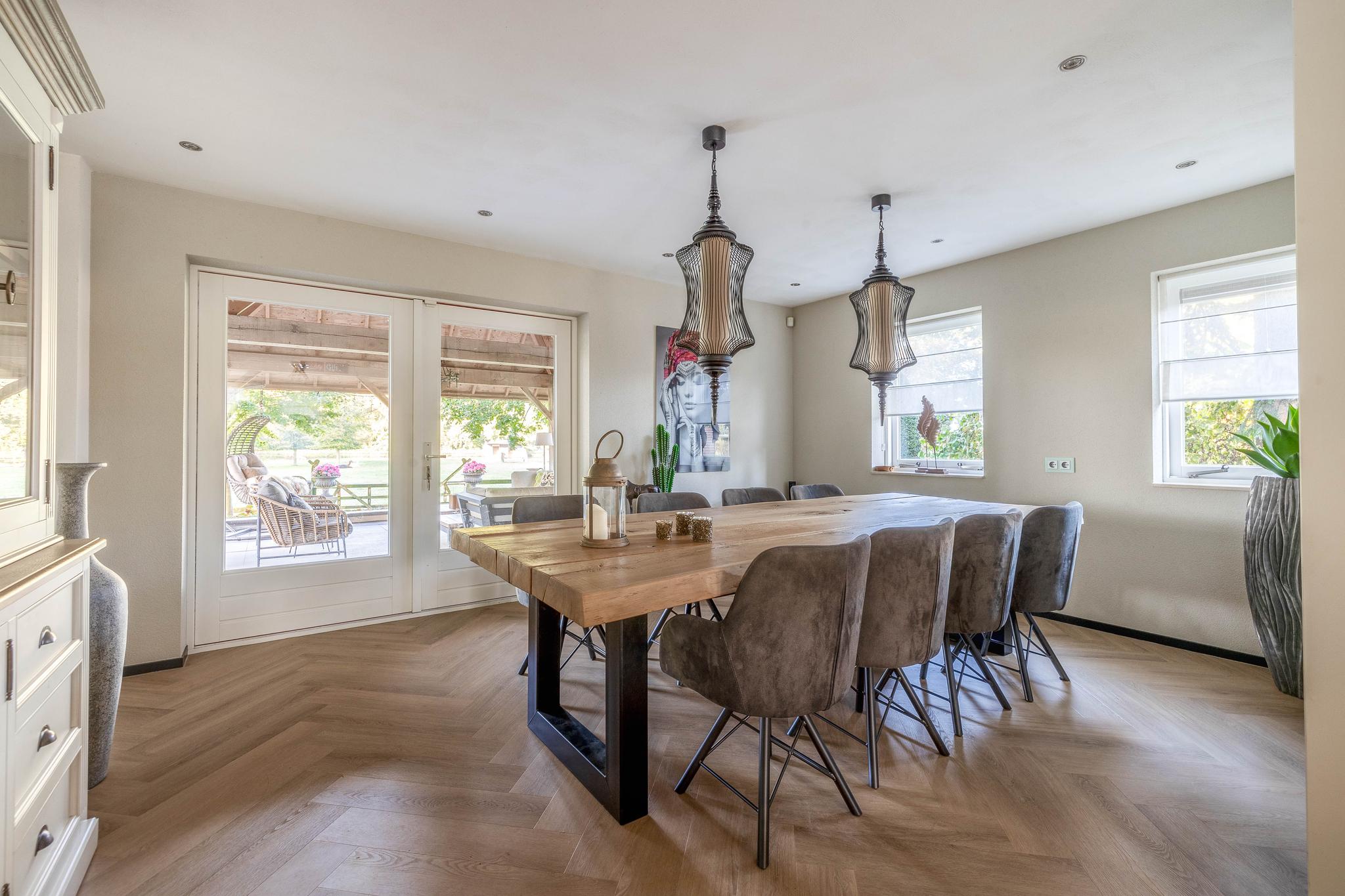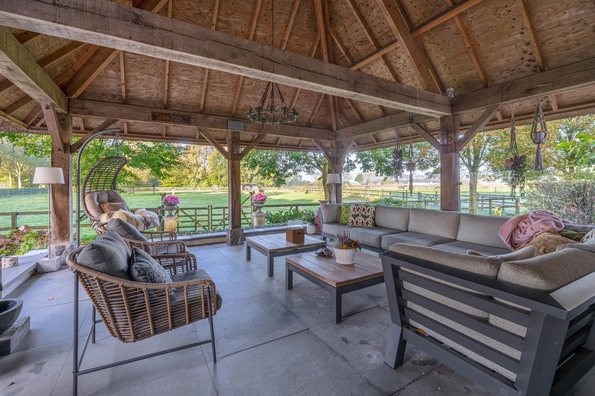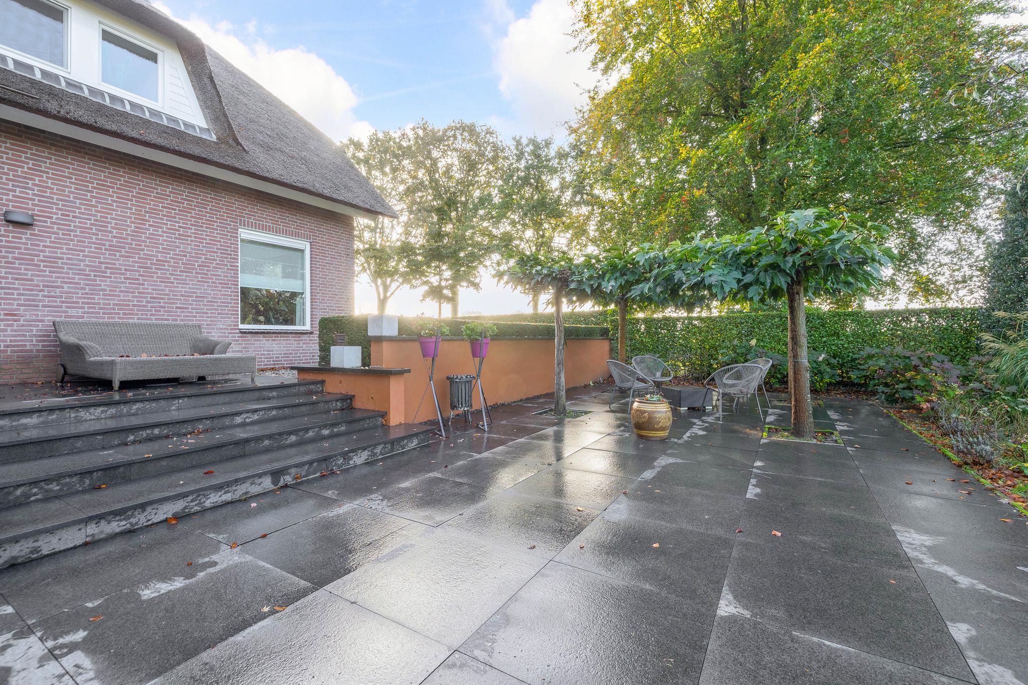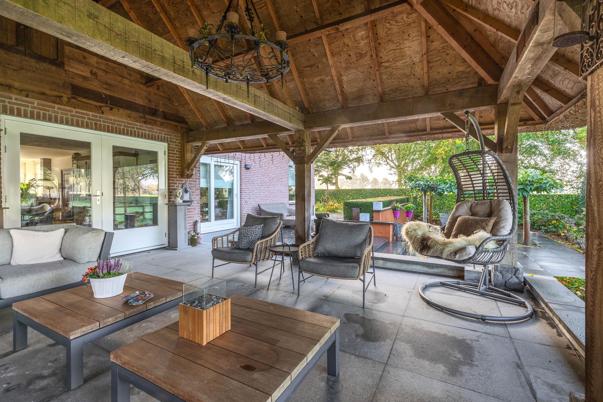 De tuin rondom de woning gelegen is fraai aangelegd en goed onderhouden. De tuin is ingericht met borders met vaste beplanting, bomen, gazon en diverse terrassen. Aan de voorzijde is een terras gelegen, aan de achterzijde beschikt het terras over een zeer fraaie en sfeervolle overkapping. Deze overkapping is opgetrokken uit eikenhout en voorzien van een glazen wand. Het dak is bedekt met riet. Het terras geeft een fraai uitzicht op de weilanden. Kortom een heerlijk plekje om te vertoeven! Iets verderop is een volière en nog een overdekt terras gesitueerd. Ook vanuit hier is er een prachtig zicht op de weilanden.