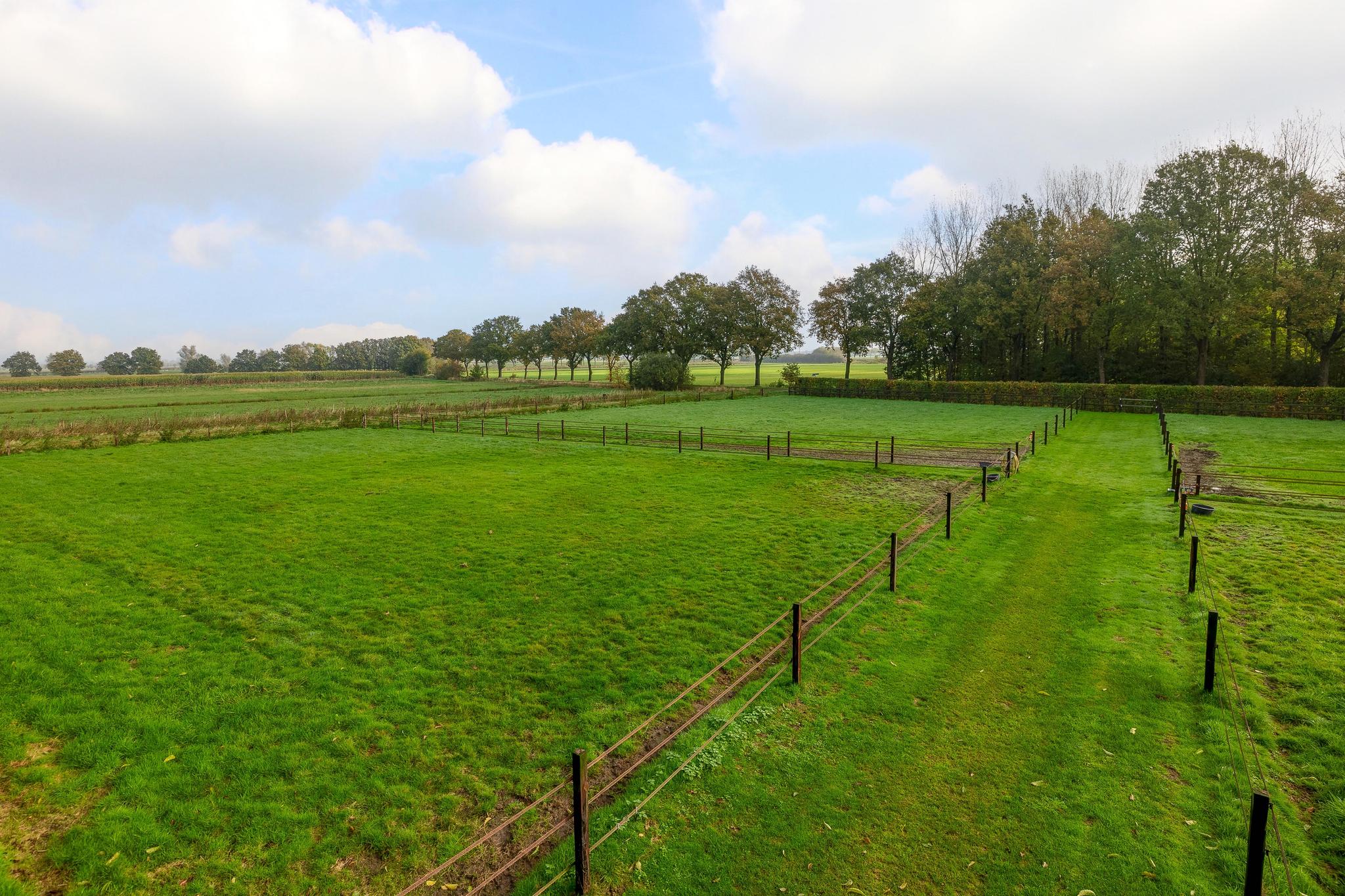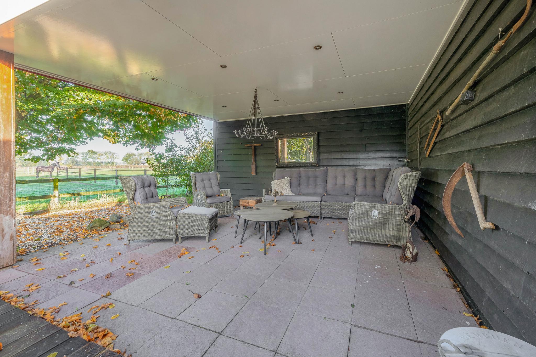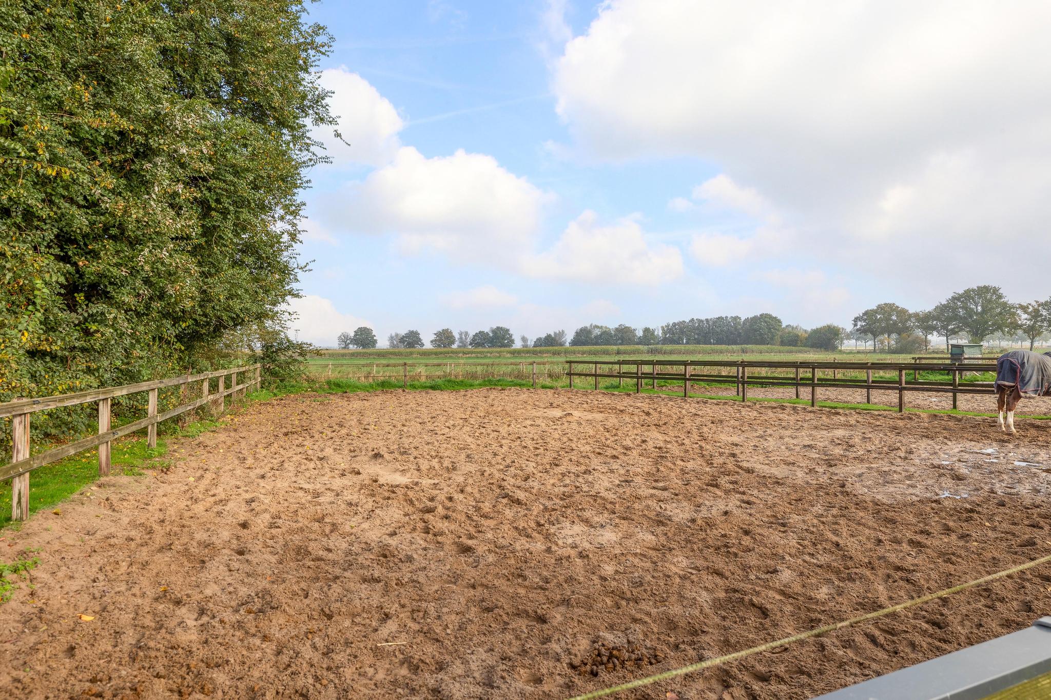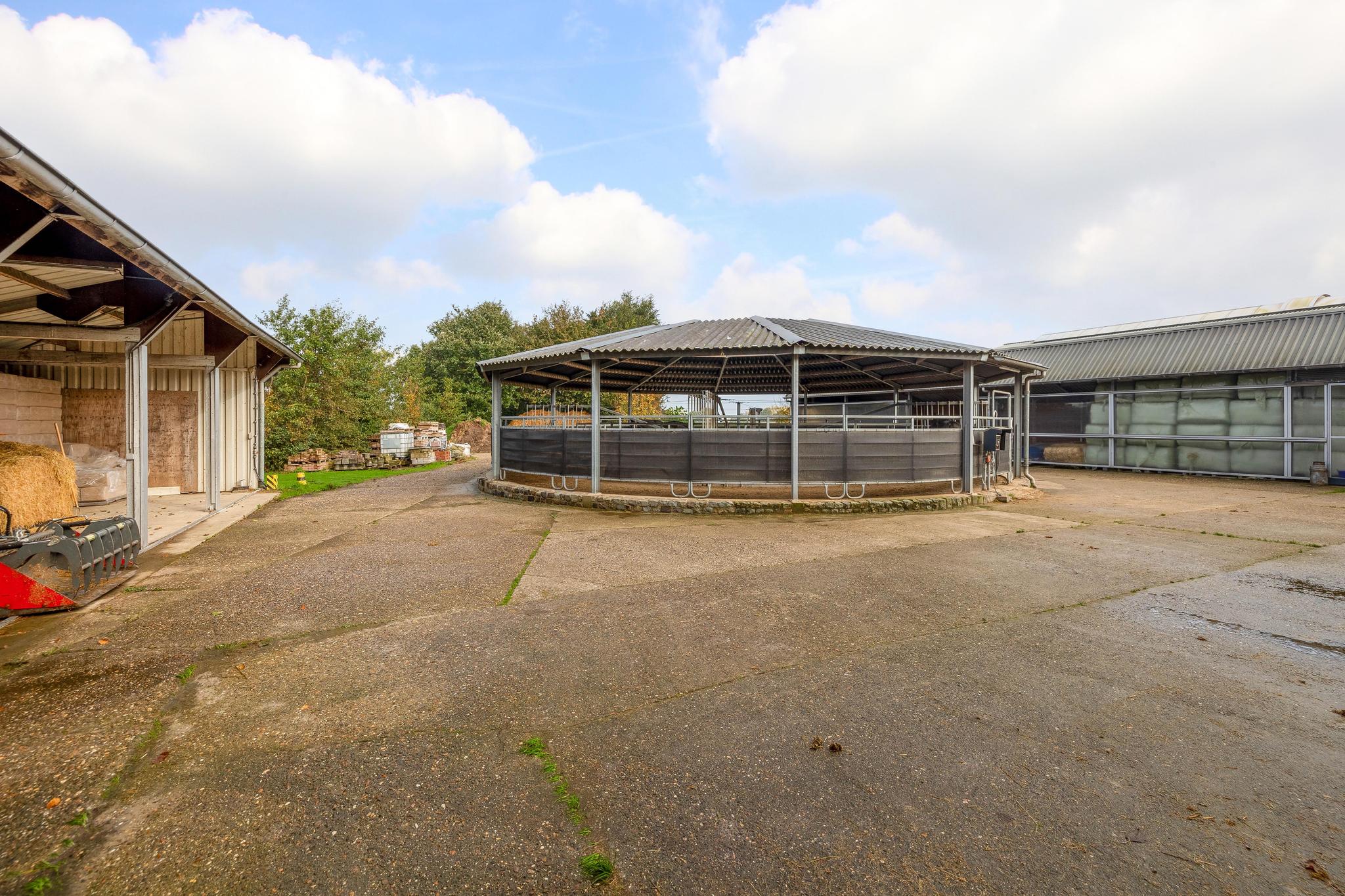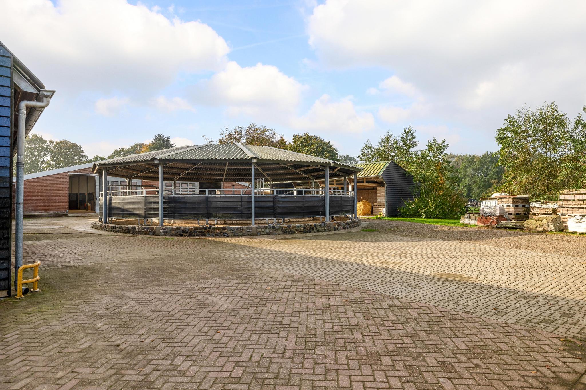 Het erf is verder ingericht met een buitenpiste, overdekte stapmolen, een longeercirkel, diverse paddocks, een opslag/veldschuur, schuur, mestvaalt, weiland en een vrijstaande loods. Er is voldoende parkeergelegenheid aanwezig voor het stallen van o.a. trailers en vrachtwagens. Het erf kan worden afgesloten met een elektrische openslaande poort. De opslag/veldschuur met open front is opgetrokken uit deels metselwerk / deels damwand met houten spanten en een damwand dak.