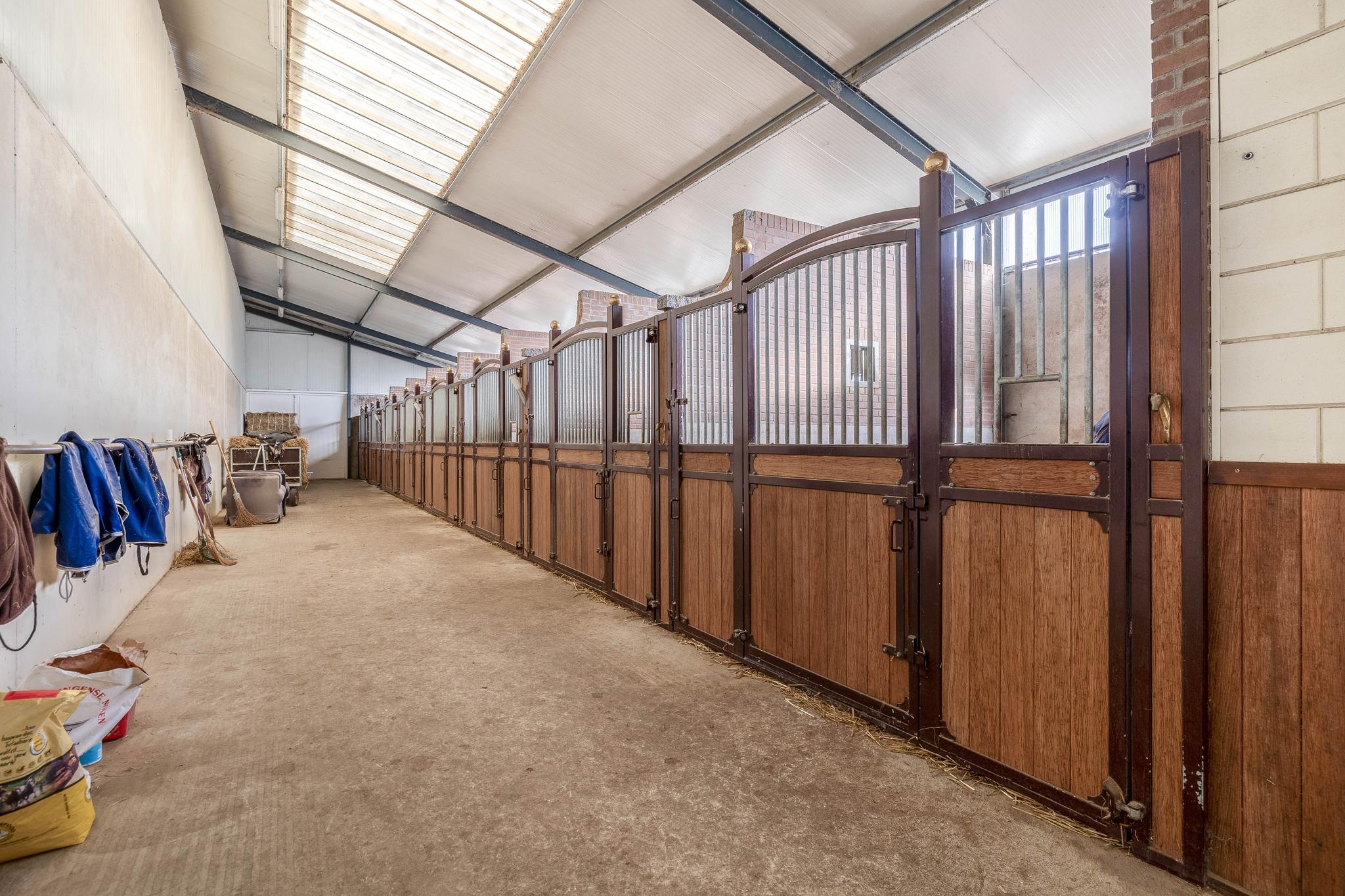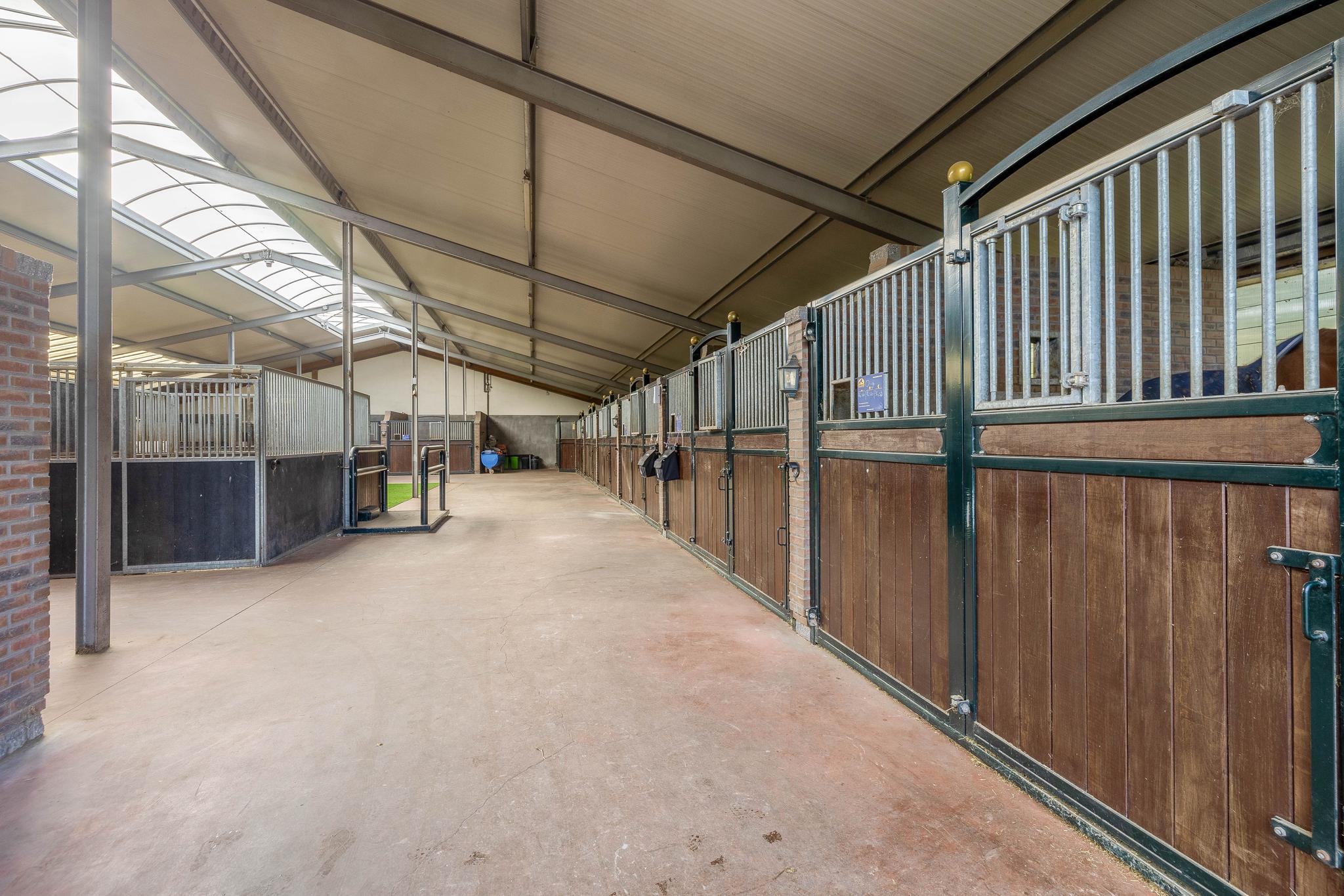 Het stalgedeelte aan de linkerzijde is uitgerust met 16 paardenboxen. Deze boxen zijn voorzien van deels hardhouten / deels gepoedercoate en deels gegalvaniseerde voorwanden. De tussenwanden zijn van metselwerk en deels bezet. De deuren de voorwanden zijn draaibaar. 2 boxen zijn voorzien van deels kunststof / deels gegalvaniseerde voor- en tussenwanden en schuifdeuren. Er is tevens 1 ponybox aanwezig. Er zijn 2 wasplaatsen en een solarium aanwezig. De wasplaatsen zijn uitgerust met een warm- en koudwatervoorziening. Vanuit het stalgedeelte is er toegang tot een hal waar de 2 zadelkamers gesitueerd zijn. Vanuit deze hal is er eveneens toegang tot de ontvangstruimte en de binnenpiste. De royale ontvangstruimte is afgewerkt met een tegelvloer, deels metselwerk/deels stucwerk wanden en een systeemplafond. Er is een toiletgroep gesitueerd bestaande uit een toiletruimte, invalidetoilet en een portaal met 2 wastafels. Tevens is er een complete keuken aanwezig. De keuken is ingericht met een oven, combimagnetron, vaatwasser, inbouw koffiezetapparaat, een spoelbak en een kookplaat. n de ontvangstruimte is de meterkast aanwezig. Hier is de opstelling voor de CV-combiketel gesitueerd. Ook beschikt de ruimte over een alarminstallatie. Vanuit de ontvangstruimte is er een fraai uitzicht op de binnenpiste. Openslaande deuren bieden toegang tot het erf. De naastgelegen binnenpiste (ca. 20mtr. x 60mtr.) is uitgerust met een eb/vloedbodem en een hardhouten bakrand (Horsmans). Een lichtkoepel in de nok en raampartijen in de kopgevel zorgen voor natuurlijke lichtinval, ook is er ventilatie aanwezig. Verder is de piste uitgerust met een spiegelwand. Een roldeur aan de achtergevel zorgt voor toegang tot het erf. Vanuit de binnenpiste is er toegang tot het stalgedeelte aan de rechterzijde. Dit stalgedeelte beschikt over 13 paardenboxen. Deze boxen (ca 4mtr. x 3mtr.) zijn voorzien van deels gepoedercoate / deels gegalvaniseerde en draaibare deuren. Ook zijn de boxen voorzien van een buitenluik. Tevens is hier een zadelkamer, wasplaats en een solarium aanwezig. Vanuit dit stalgedeelte is er toegang tot een kantine. Deze kantine is afgewerkt met een laminaatvloer en een systeemplafond. De kantine beschikt over een aparte CV-combiketel. Openslaande deuren aan de achtergevel zorgen voor toegang tot het erf.