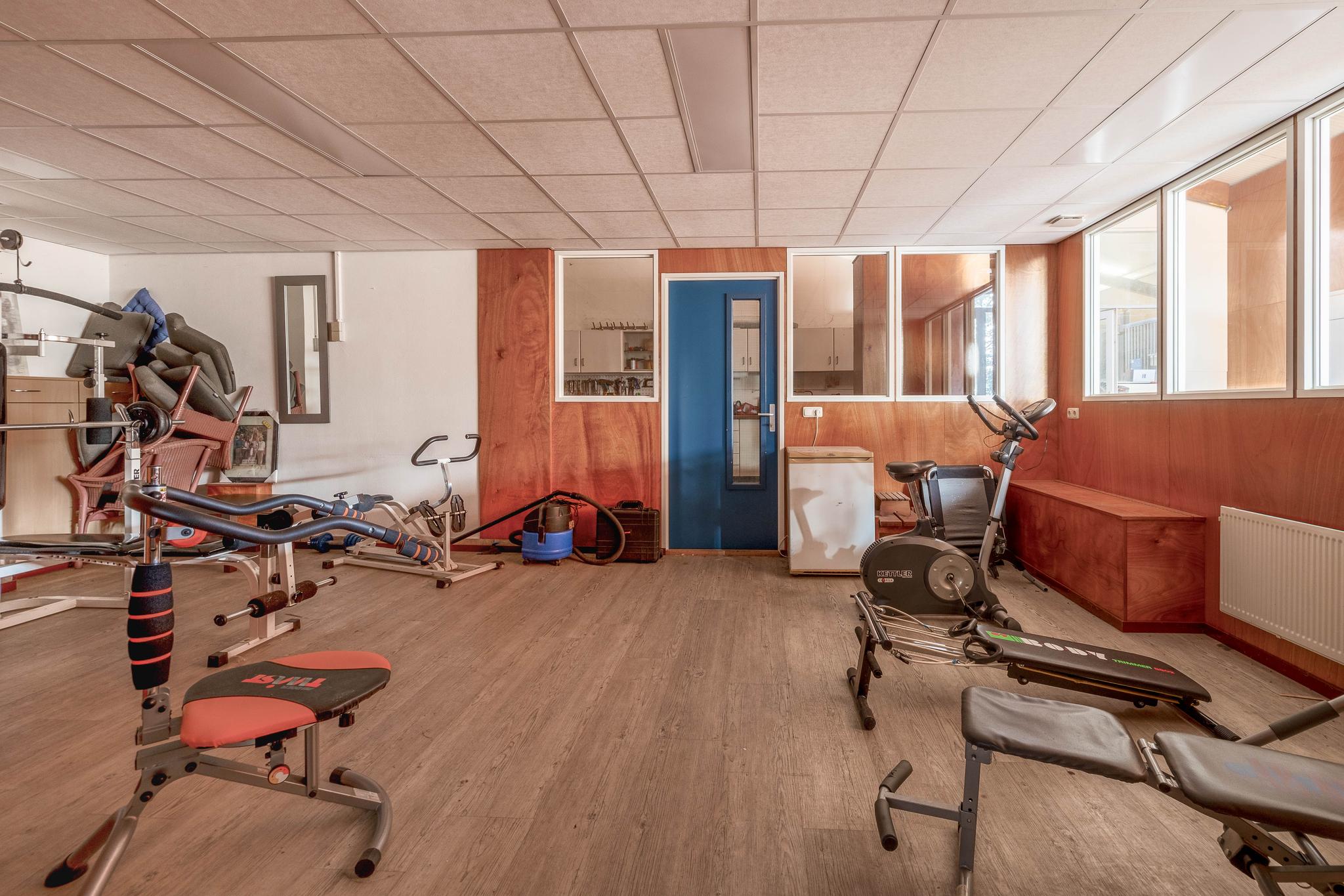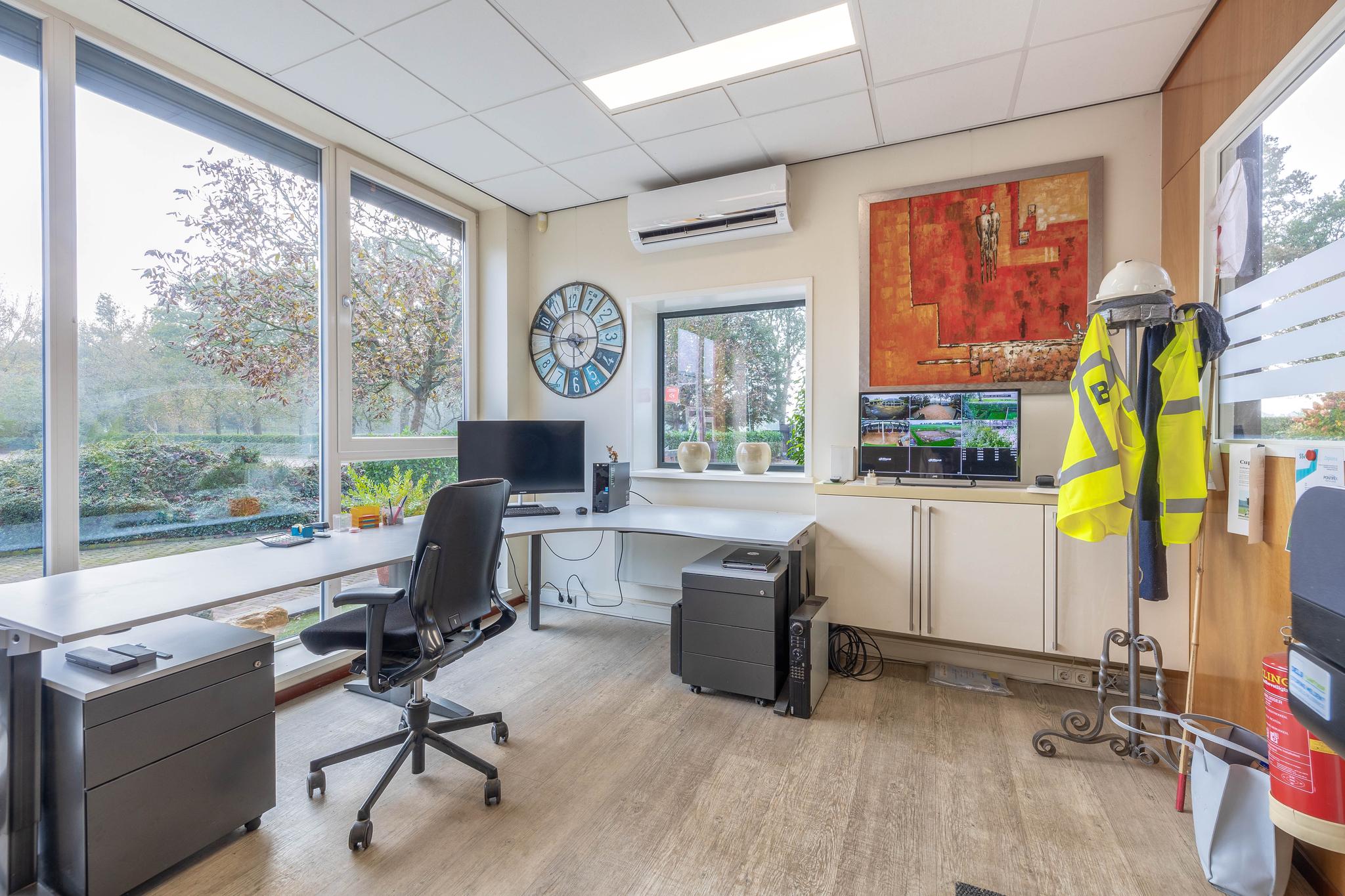 Aan de voorzijde van het gebouw is een kantoorruimte met berging, werkplaats en multifunctionele ruimte en een appartement gelegen. De kantoorruimte is voorzien van een PVC-vloer, stucwerk wanden en een systeemplafond. Tevens is er airco aanwezig. Grote raampartijen zorgen voor veel natuurlijke lichtinval en praktisch uitzicht op de toegangspoort en parkeerplaats. De berging is uitgerust met de beregeningspomp ten behoeve van de buienpiste, weilanden en de tuin. Ook is hier de omvormer voor de zonnepanelen (81 stuks) gesitueerd. De werkplaats met betonnen vloer is uitgerust met vaste kasten en de aansluitingen voor de wasapparatuur. Een vaste trap biedt toegang tot de zolderruimte. De multifunctionele ruimte, nu in gebruik als fitnessruimte is voorzien van een PVC-vloer, deels metselwerk / deels stucwerk wanden en een systeemplafond. De aansluiting voor de CV-combiketel ten behoeve van de fitnessruimte en het appartement zijn hier gesitueerd. Vanuit deze ruimte is er toegang tot het appartement en een vaste trap biedt toegang tot de zolderruimte.