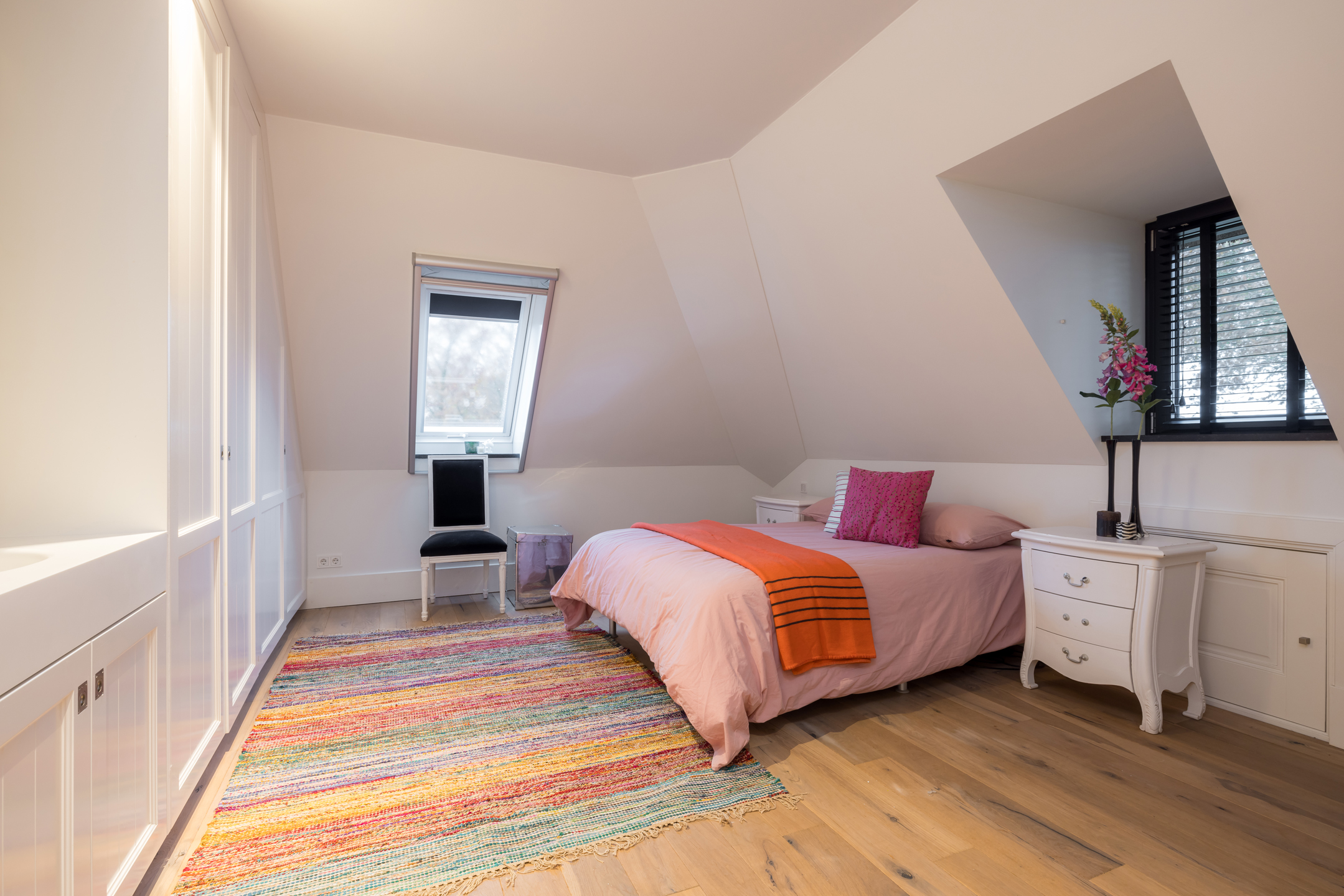 Bereikbaar via een vaste trap als een personen lift vanuit de hal. Boven aangekomen, is er een vide met ruime overloop met hier 5 slaapkamers en 2 badkamers. De hele etage is voorzien van een prachtige eikenhouten plankenvloer. De badkamers hebben een keramische tegelvloer. Alle slaapkamers zijn ruim, hebben dakkapellen en dus voldoende daglicht met overal uitzicht op de tuin en de landelijke omgeving. Alle slaapkamers zijn ruim, hebben dakkapellen en dus voldoende daglicht met overal uitzicht op de tuin en de landelijke omgeving. Het afwerkingsniveau is ook hier onberispelijk en je waant je hier in een 5 sterren hotel. Een van de 5 slaapkamers (Masterbedroom) is nog veel ruimer en doet momenteel dienst als kantoorruimte, werkelijk schitterend. Alle slaapkamers zijn voorzien van een airconditioning. Een grote badkamer met dubbele wastafel, bad en douche. De 2e badkamer is van kleiner formaat en voorzien van een wastafel en douche. Het toilet is separaat.