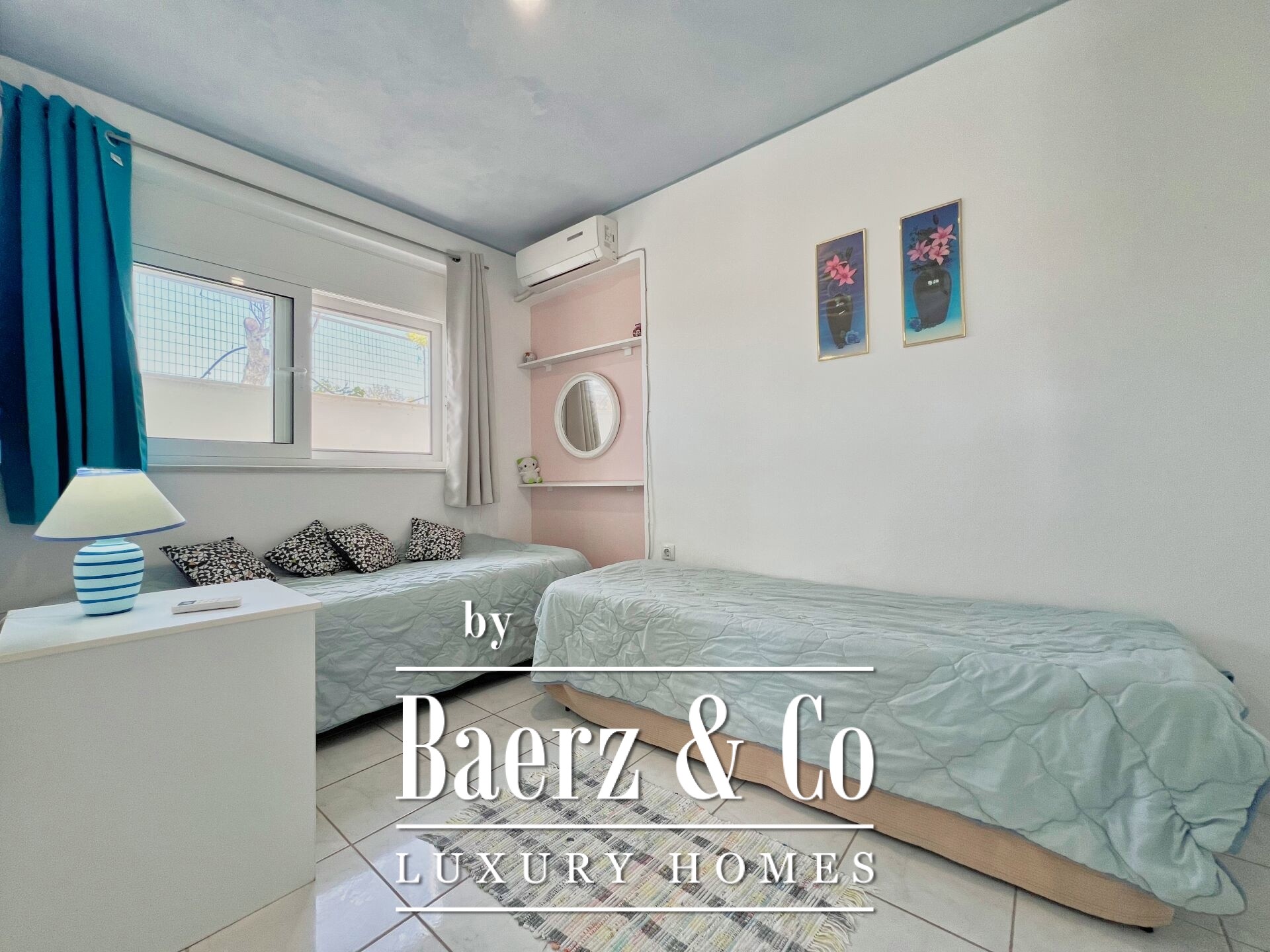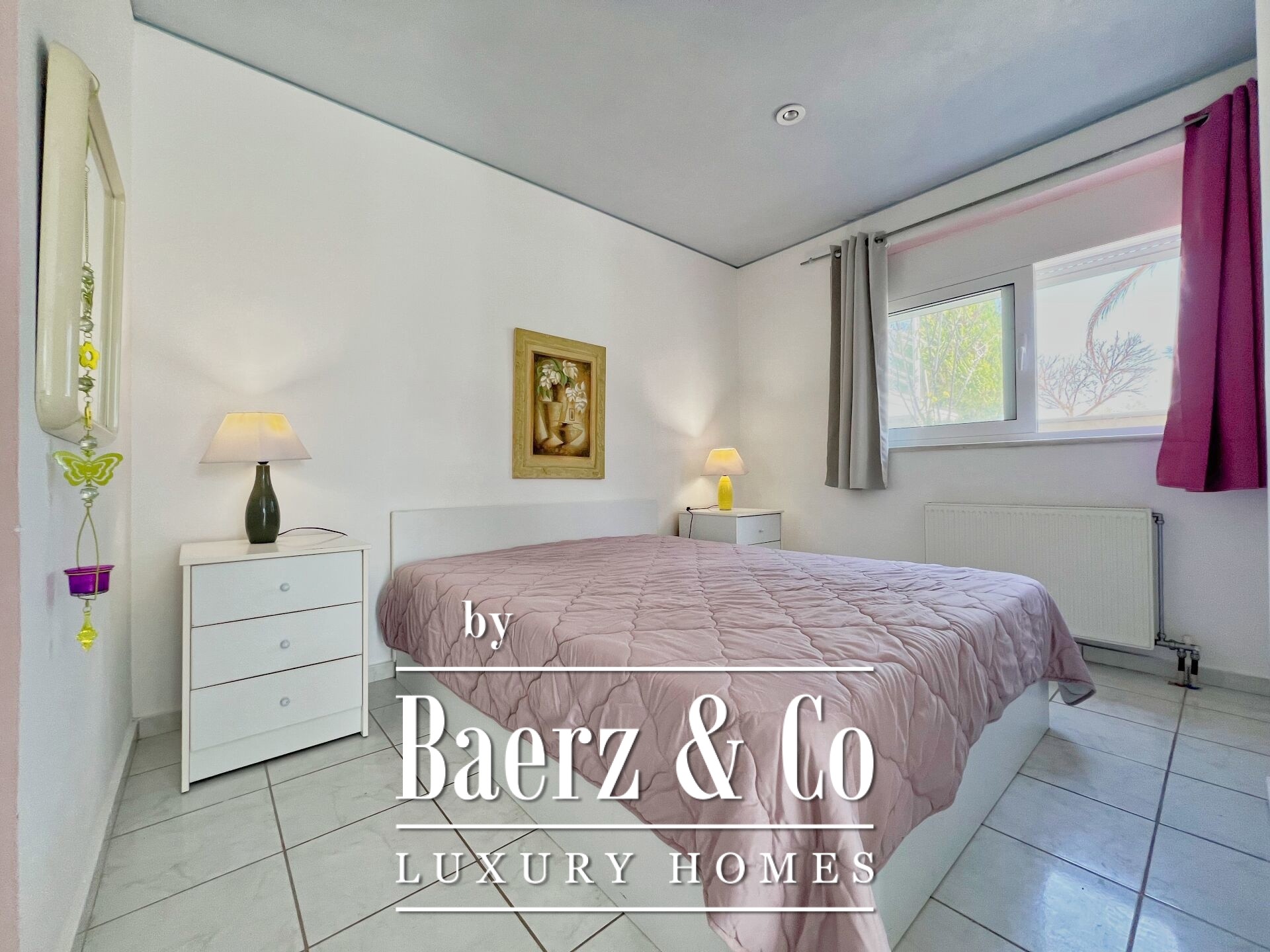 De veiligheid is gewaarborgd dankzij een beveiligde voordeur, alarmsysteem en camerabewaking. Voor de veeleisende gastheer is er een barbecuegedeelte en een royale tuin van 300 m², die uitnodigt tot toekomstige uitbreidingen of ongestoorde ontspanning. Praktische voorzieningen zoals een ontziltingsinstallatie, watertank en dompelpompen waarborgen comfort het hele jaar door, terwijl drie open parkeerplaatsen extra gemak bieden. Deze woning combineert het vertrouwen van veilig wonen met het comfort van directe toegang tot zowel de zee als enkele van de meest verfijnde uitgaansadressen in de regio.