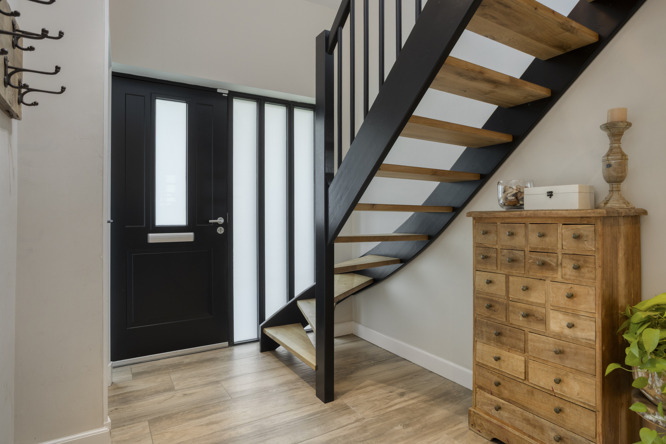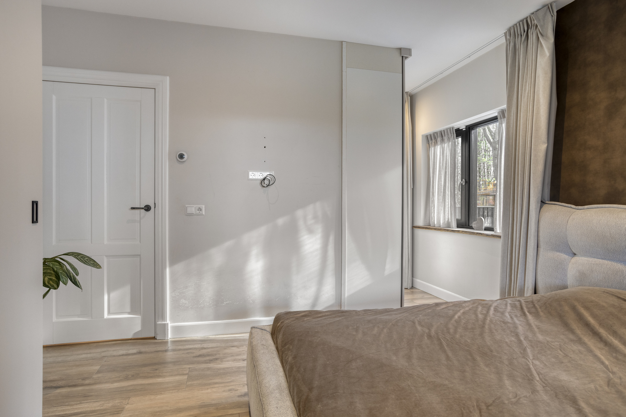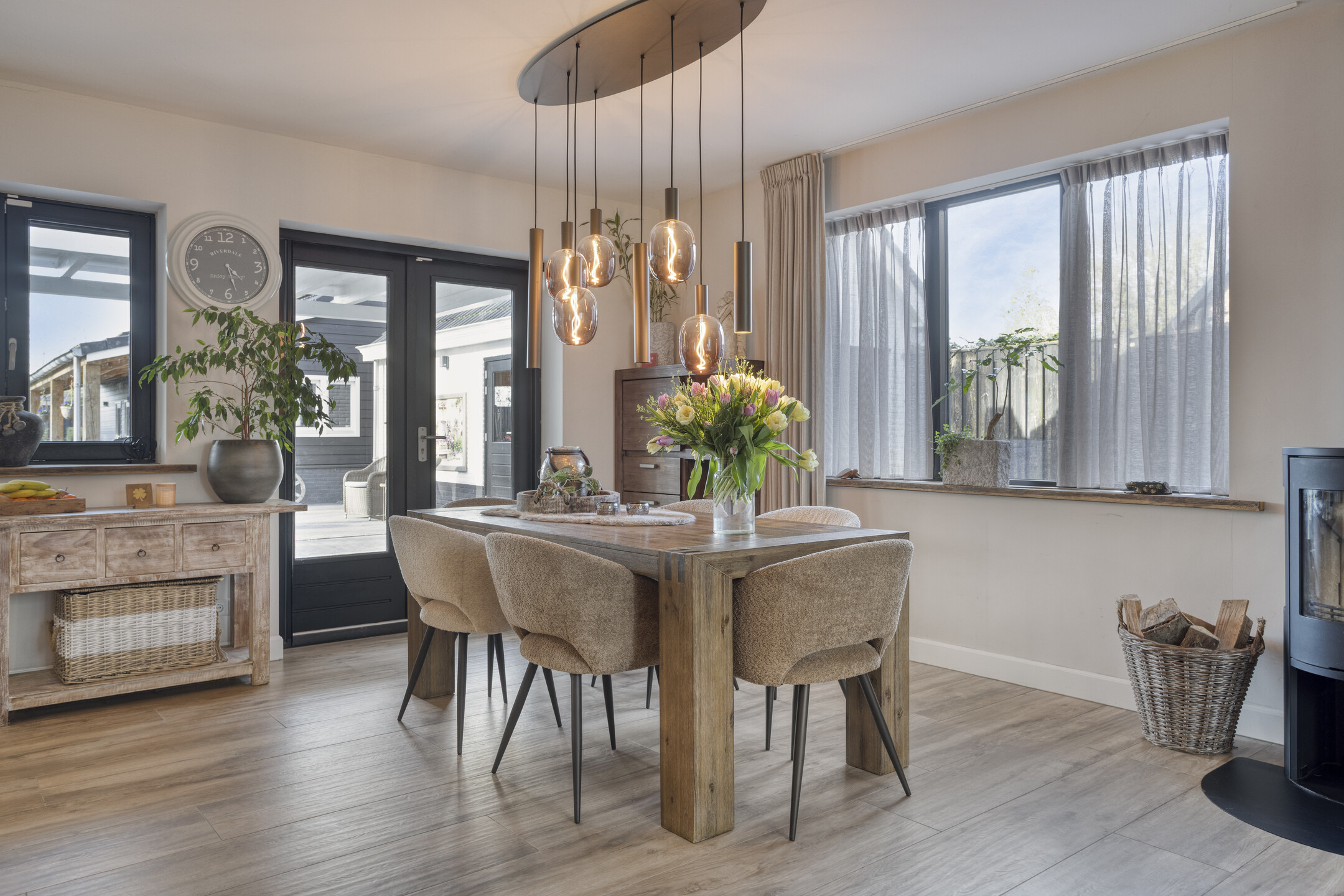 De begane grond biedt een lichte en sfeervolle woonkamer met houthaard en een open keuken voorzien van alle moderne inbouwapparatuur, inclusief wijnkoeler. Vanuit de woonkamer heeft u zicht op de tuin en directe toegang tot de luxe veranda. Fraai extra kenmerk is de aanwezigheid van de hoofdslaapkamer met een stijlvolle badkamer en-suite op de begane grond, wat deze woning uitermate geschikt maakt voor gelijkvloers wonen.