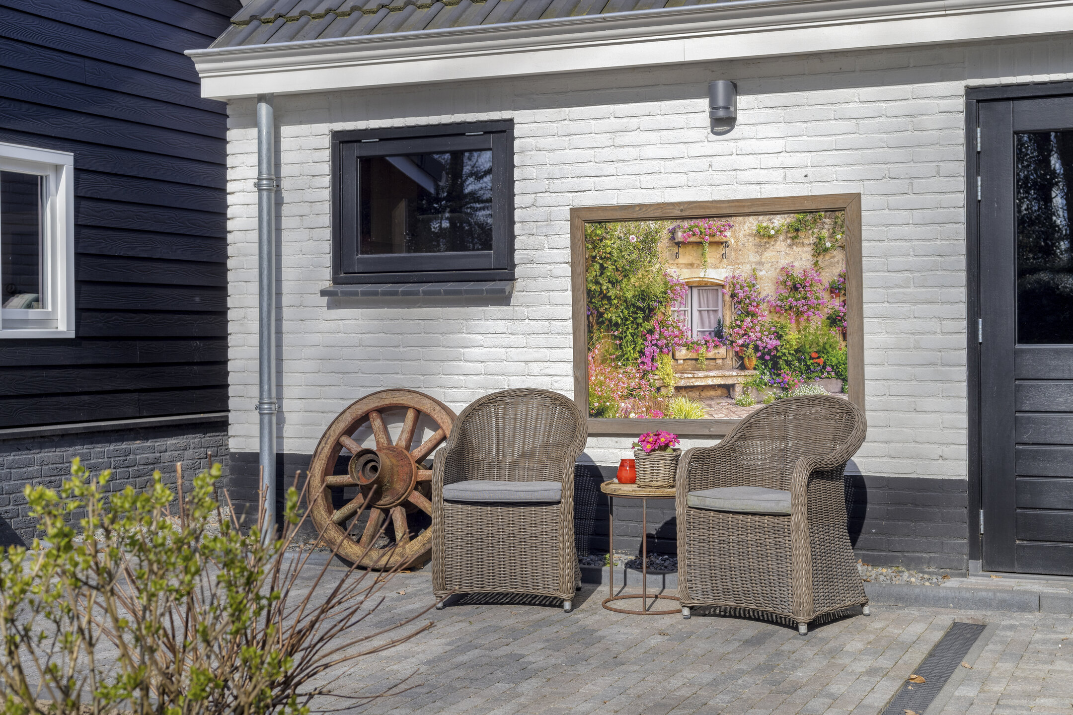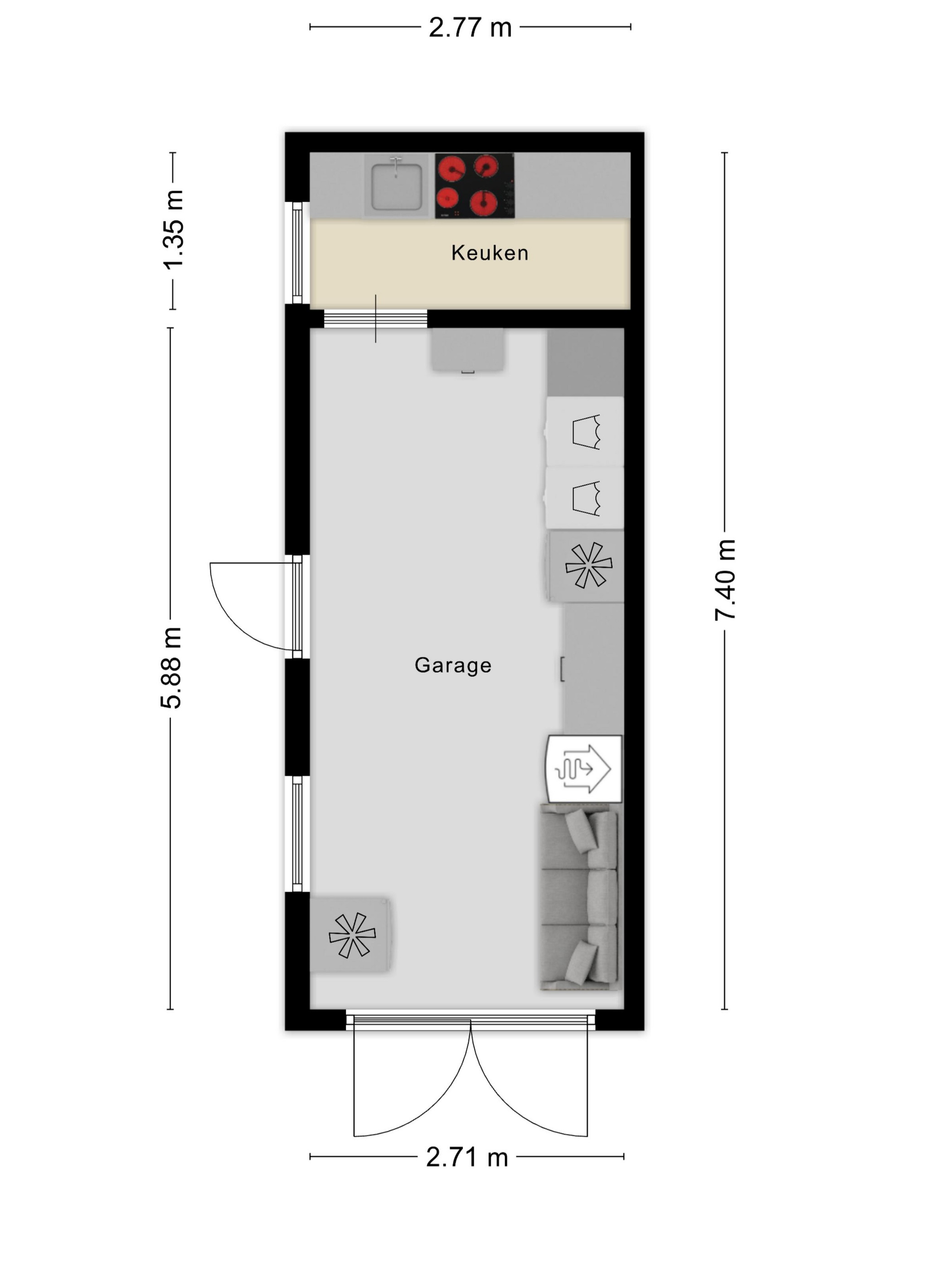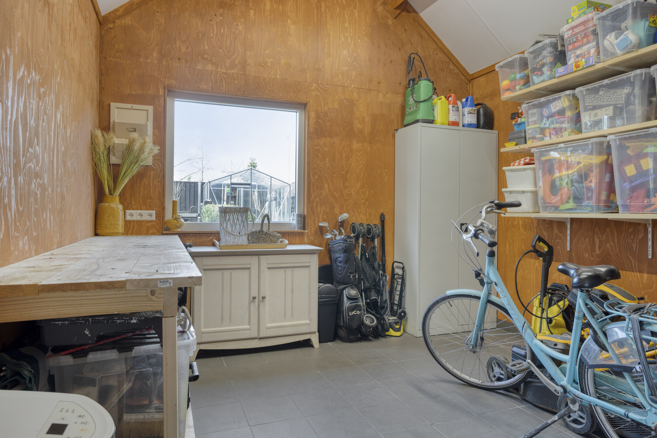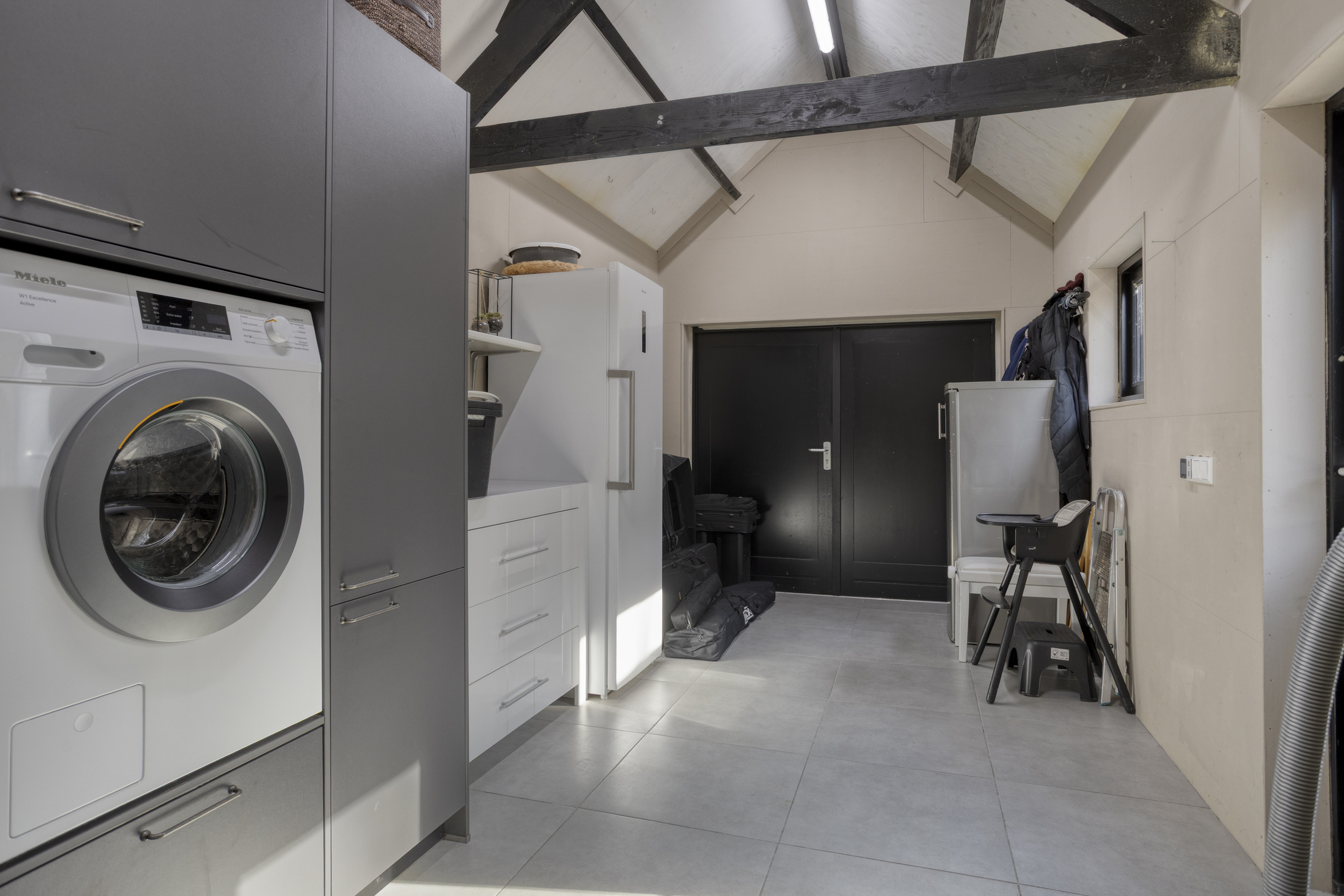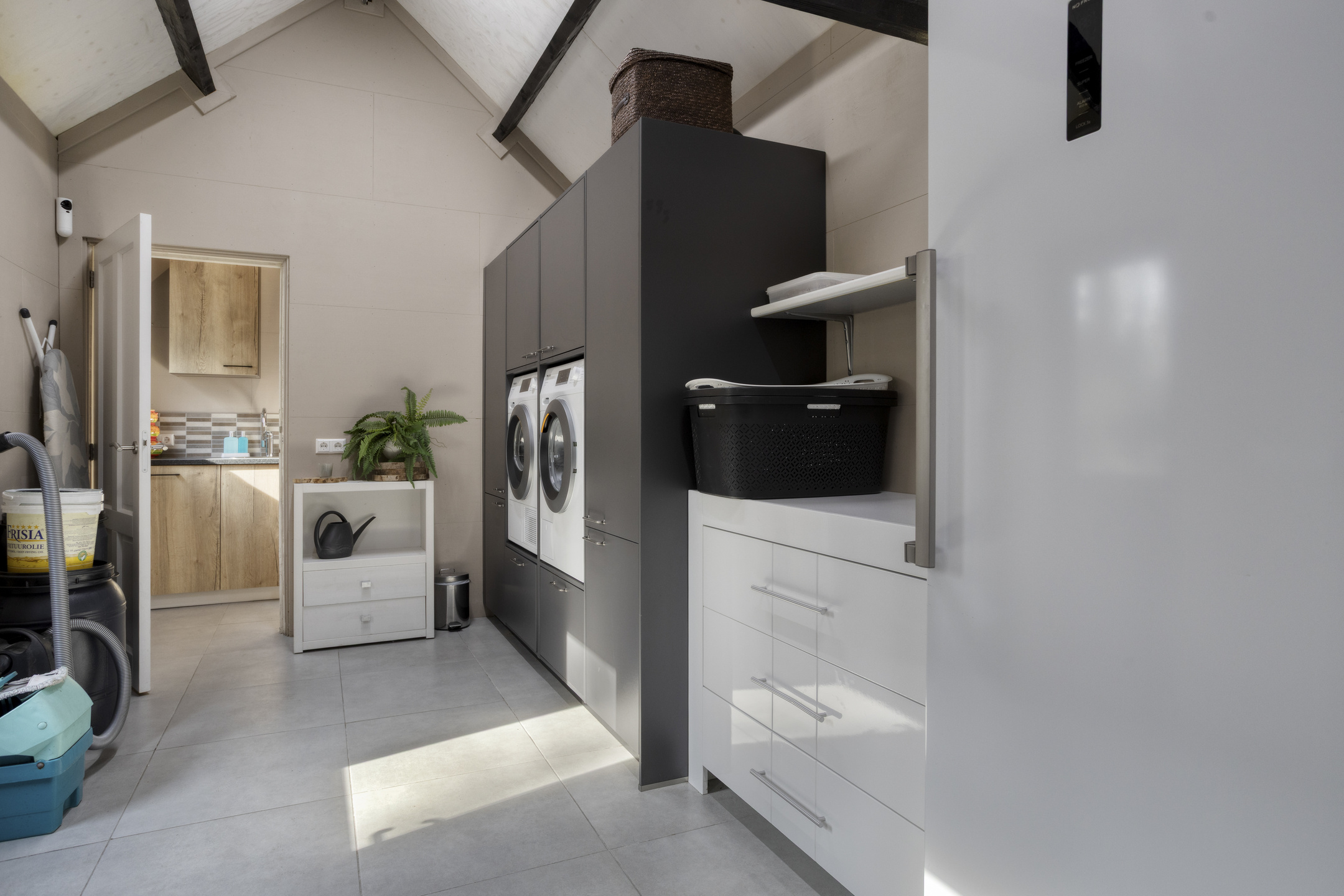 De voormalige garage is praktisch ingericht als bijkeuken met alle benodigde aansluitingen t.b.v. huishoudelijke apparatuur. Door de aanwezigheid van een dubbele deur kan de ruimte ook prima dienen als (fietsen)berging, wat bijdraagt aan het gebruiksgemak van de woning.