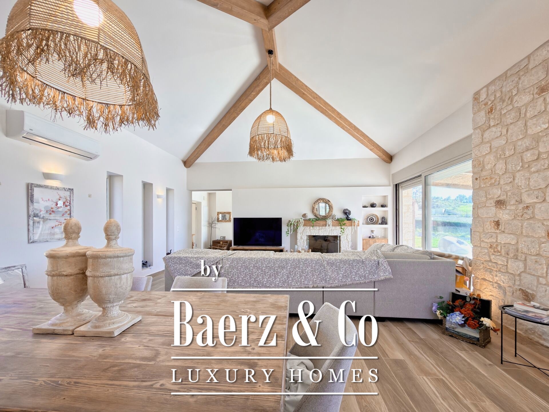 Buiten wordt de ingetogen elegantie van de patio benadrukt door een zwembad van 50 m² en een royale barbecueplek onder eiken pergola’s. Dankzij het vrije uitzicht op bergen, zee en natuur verdwijnen de grenzen tussen binnen en buiten moeiteloos. De kelder van 47 m² biedt plaats aan parkeren en opslag, terwijl het fotovoltaïsche systeem bijdraagt aan zelfvoorziening. Deze villa combineert de sereniteit van een landgoed met het comfort van een doordacht ontworpen woning, geschikt voor alle seizoenen.