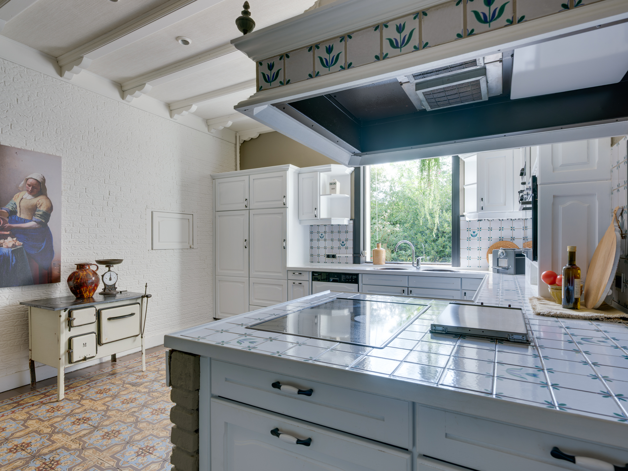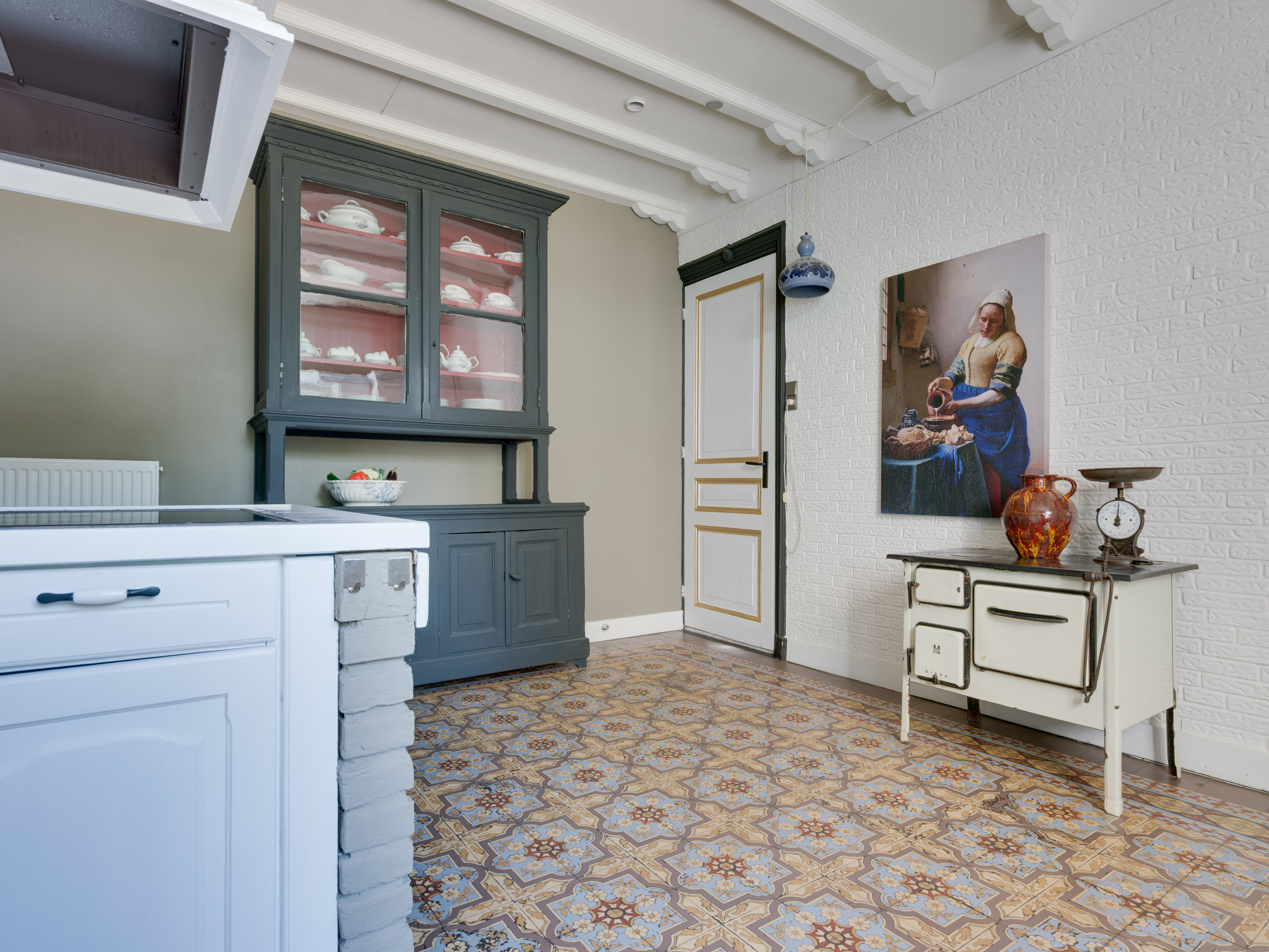 Verder vindt u op de begane grond een studeer-/werkkamer, keuken (met originele tegelvloer), bijkeuken, toegang tot de kelder en toegang tot de garage (voormalig koetshuis).
