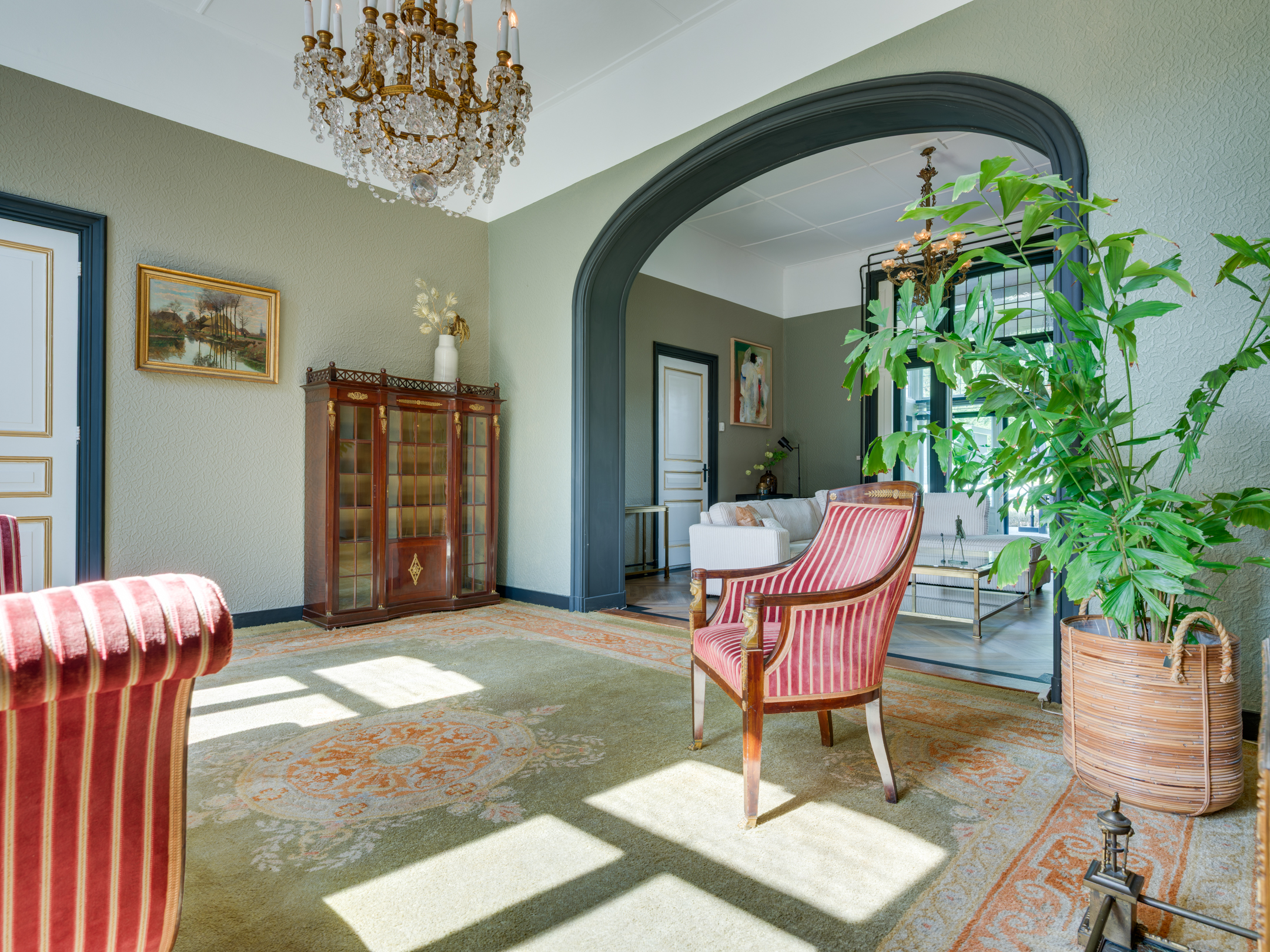 De woonkamer en en-suite salon beschikken nog over originele schoorsteenmantels, spiegels en authentieke kachels. Vanuit de woonkamer loopt u zo de serre in, met glas-in-lood en een prachtige mozaïekvloer. De tuinkamer geeft toegang tot de diepe achtertuin met zwembad.