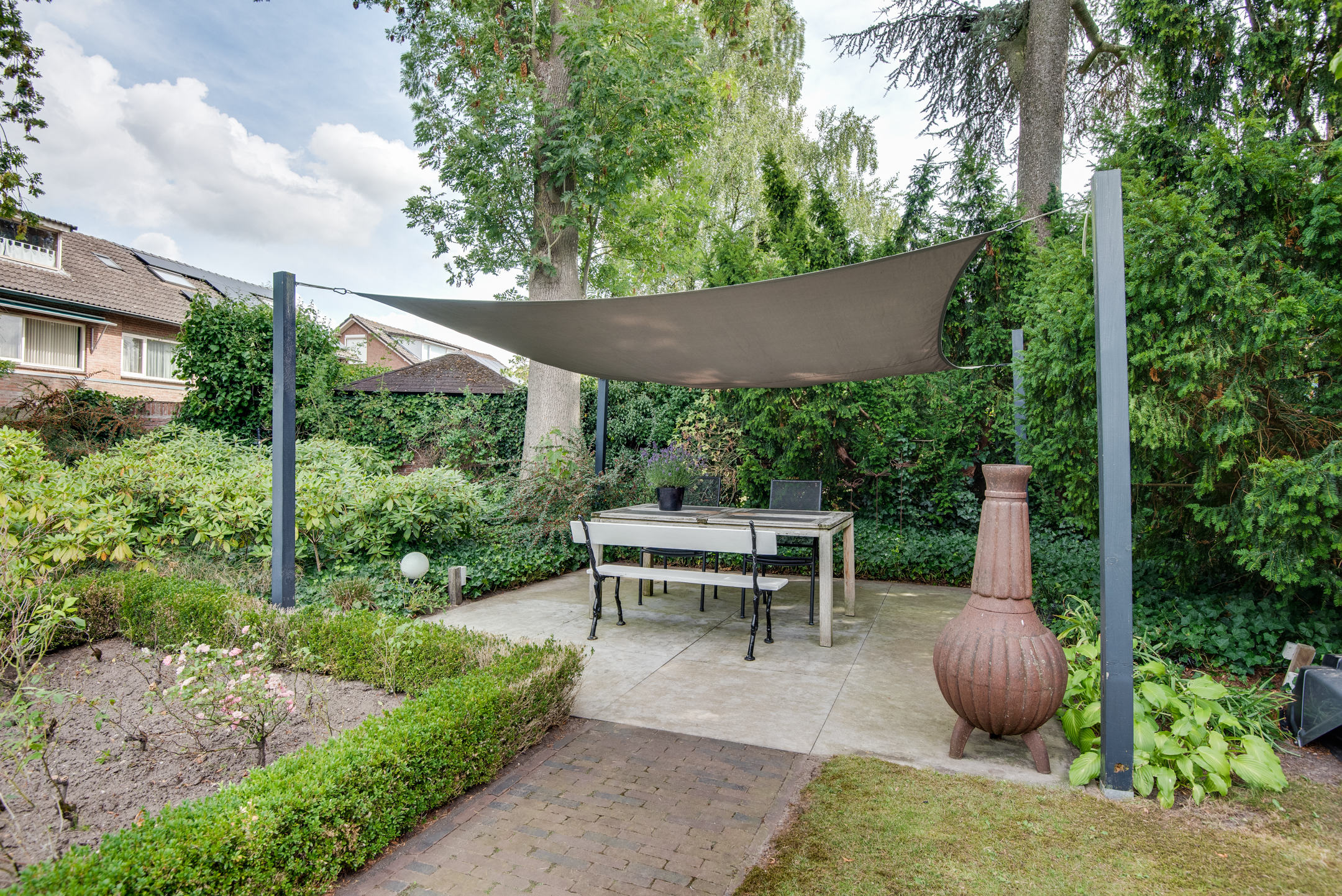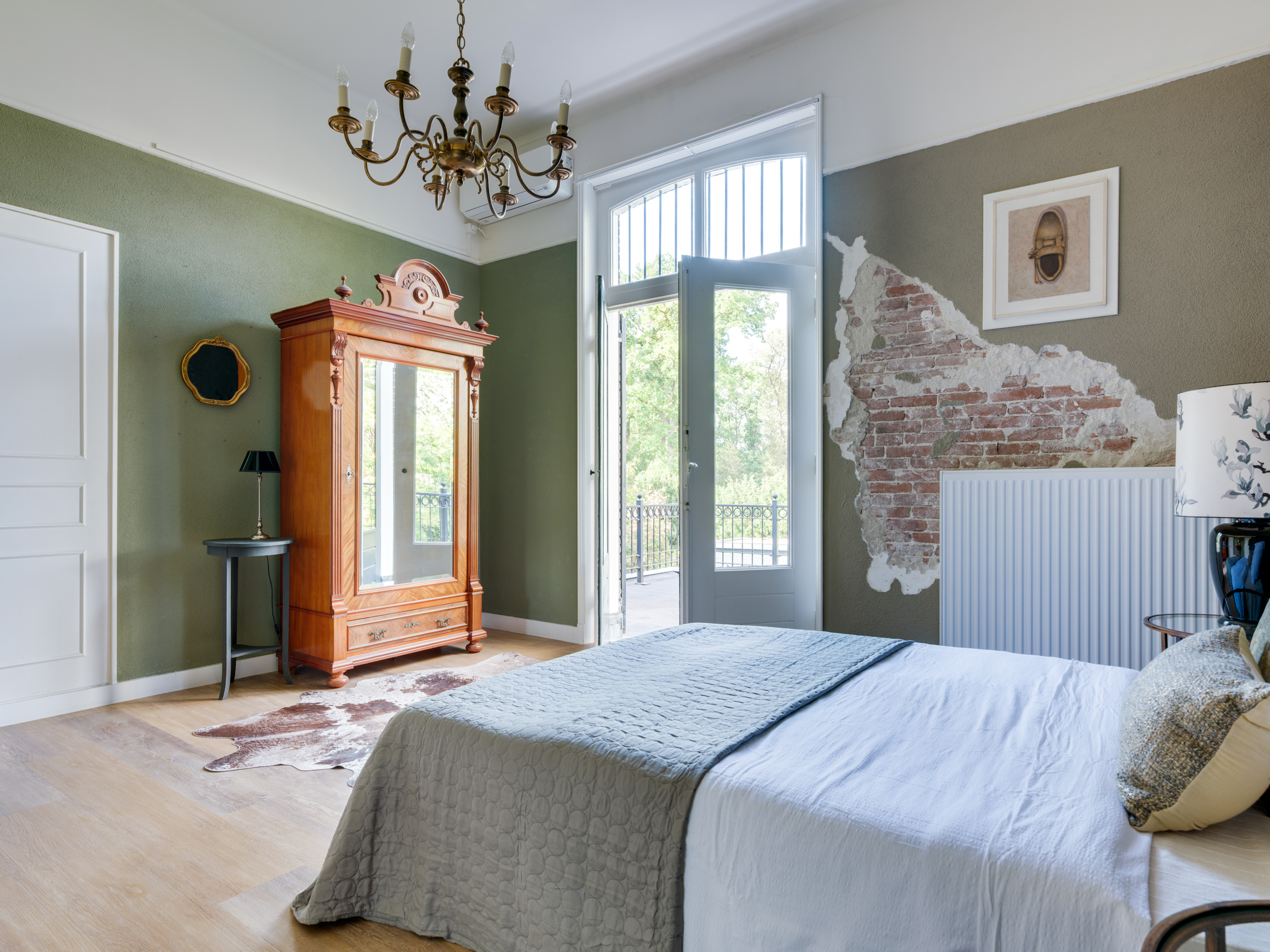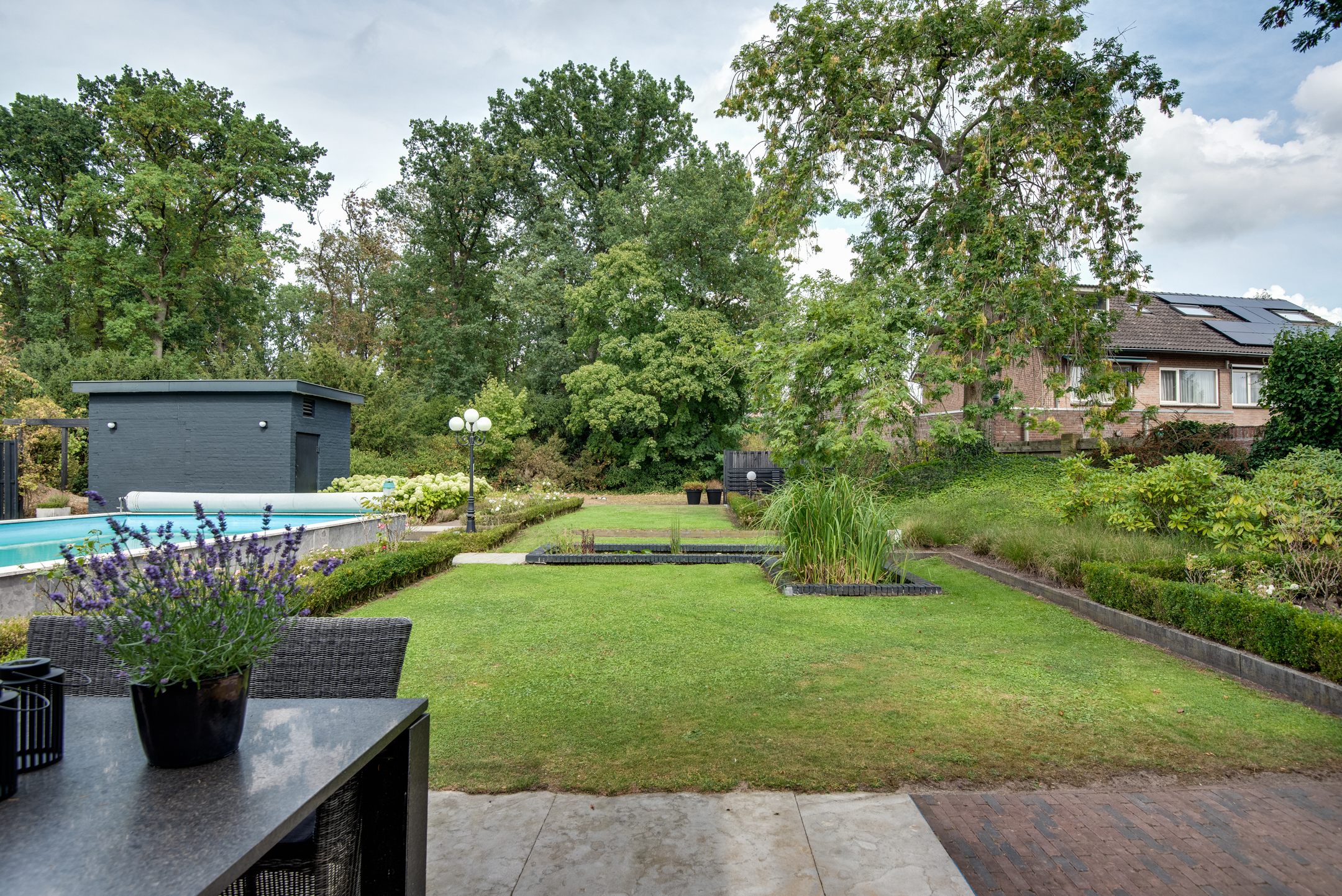 Een van de slaapkamers heeft openslaande deuren naar een dakterras. Een heerlijke plek om de dag te beginnen met uitzicht over de parkachtige tuin. Een tuin met prachtige bloemborders, volwassen bomen en gazon. Met zwembad en de diverse terrassen waar men heerlijk kan genieten van de rust die dit object te bieden heeft.