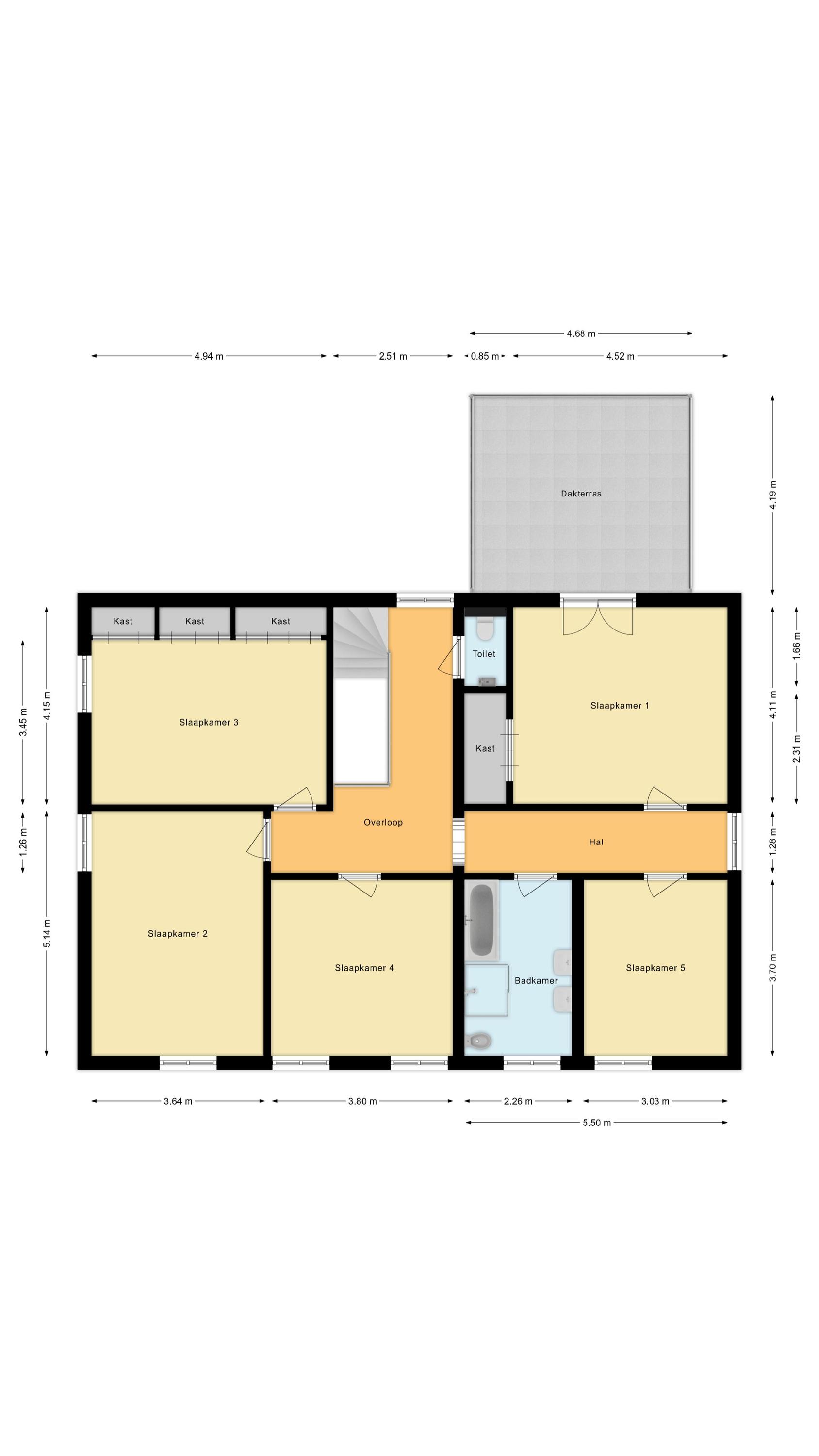 Hier bevinden zich 5 slaapkamers, een badkamer en een separate toiletruimte.