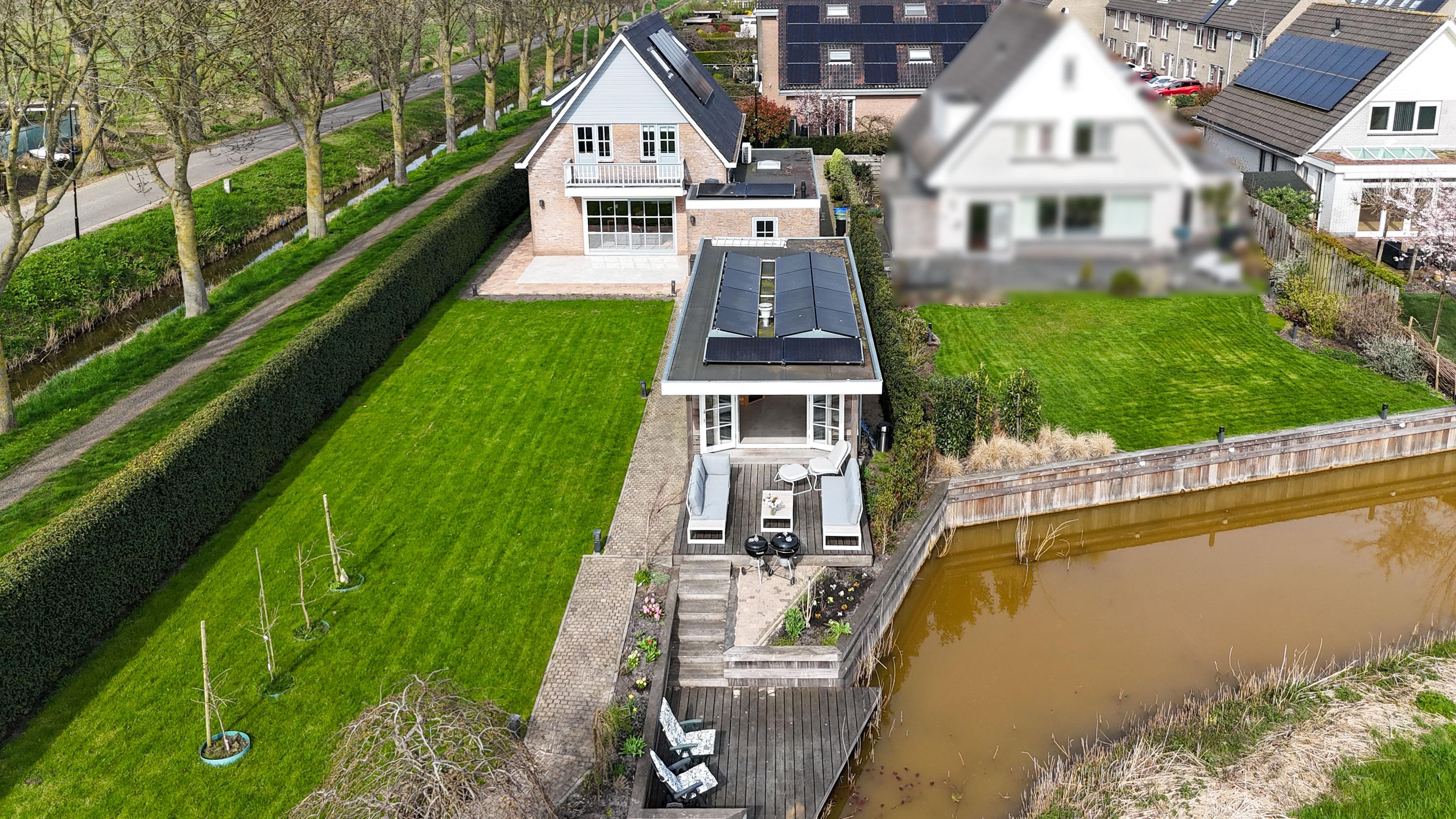 De tuin rondom de woning is met zorg aangelegd en perfect onderhouden. Dankzij een geavanceerd sproei- en druppelsysteem, gevoed door een pomp vanuit de sloot, blijft het groen in optimale conditie. Het ruime terras op het zuiden, voorzien van grote keramische tegels die naadloos aansluiten bij de vloer binnen, vormt een heerlijke plek om te genieten van zonnige dagen. Het elektrische zonnescherm is eenvoudig via een app te bedienen.