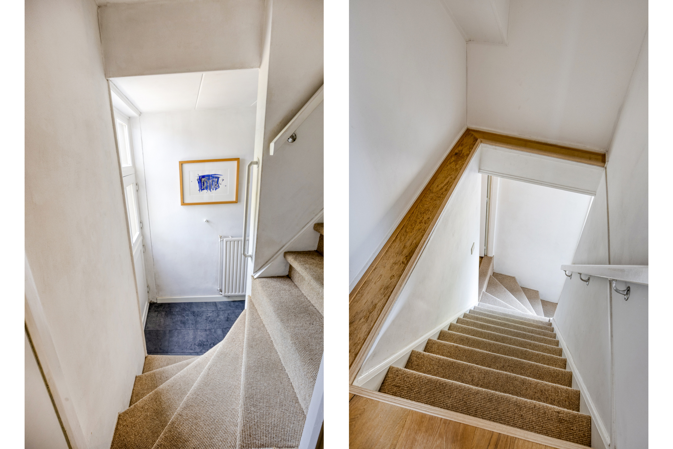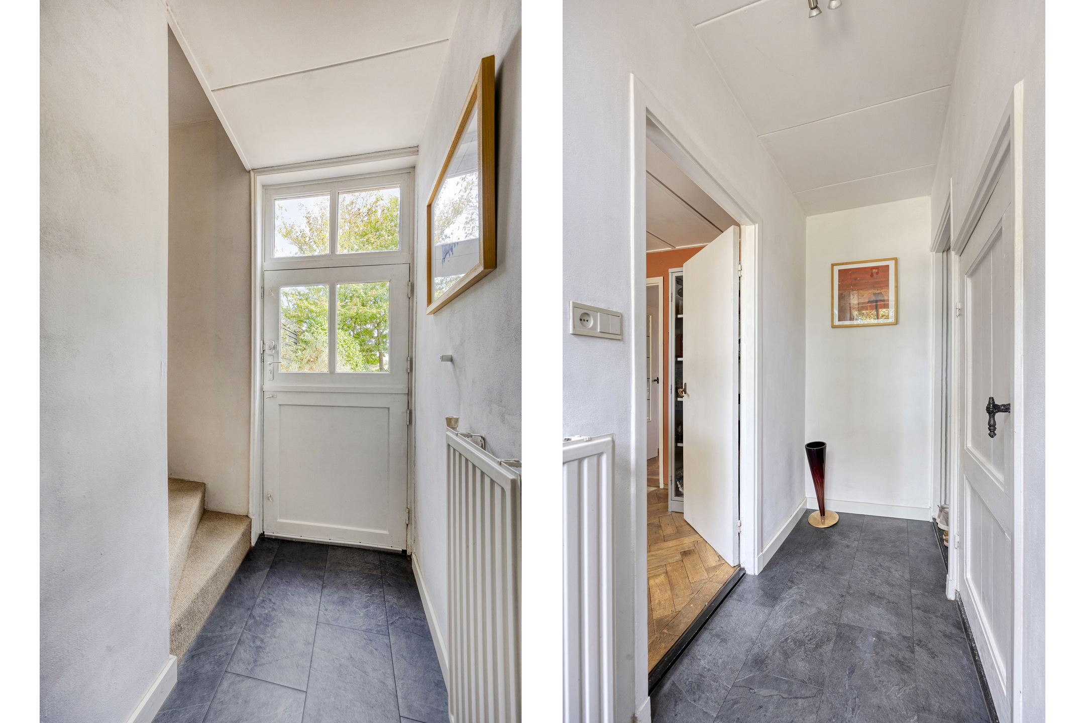 Hal/entree aan de zijkant van het huis vv. garderobe, een trap naar de 1e verdieping en een deur naar de kelder, wandafwerking stucwerk, tegelvloer, plafond afgewerkt met gipsplaten;