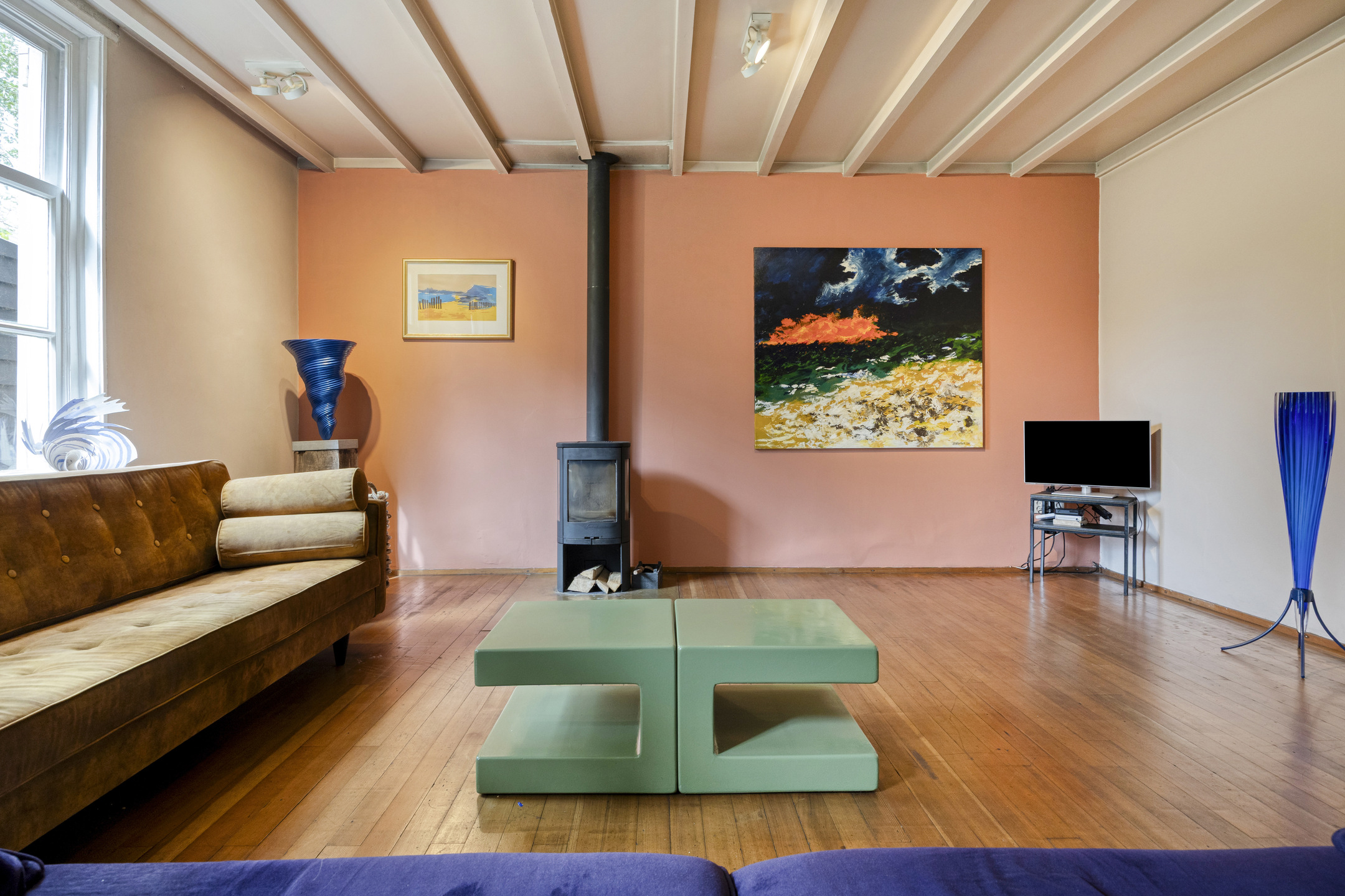 woonkamer voorzien van een houthaard met dubbelwandig doorvoer, wandafwerking stucwerk, massief houten vloer op tegelvloer (kloostervloer), balkenplafond;