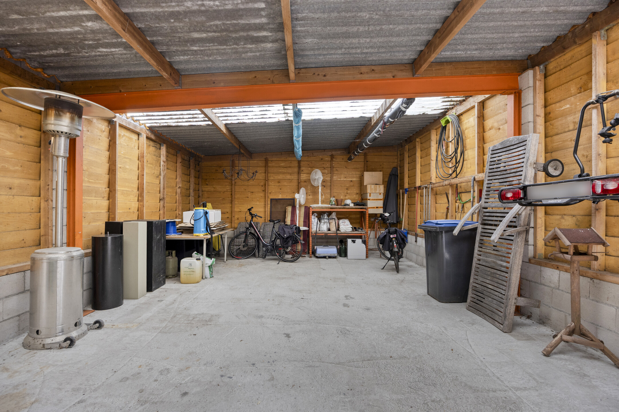 Schuur II (ca. 302 m²) verdeeld in 2 delen, vv. 2x een dubbele houten deur naar oprit/tuin, 3 loopdeuren, elektra, krachtstroom, dakisolatie en 2 bergvides, deels pannendak en deels asbest golfplaten.